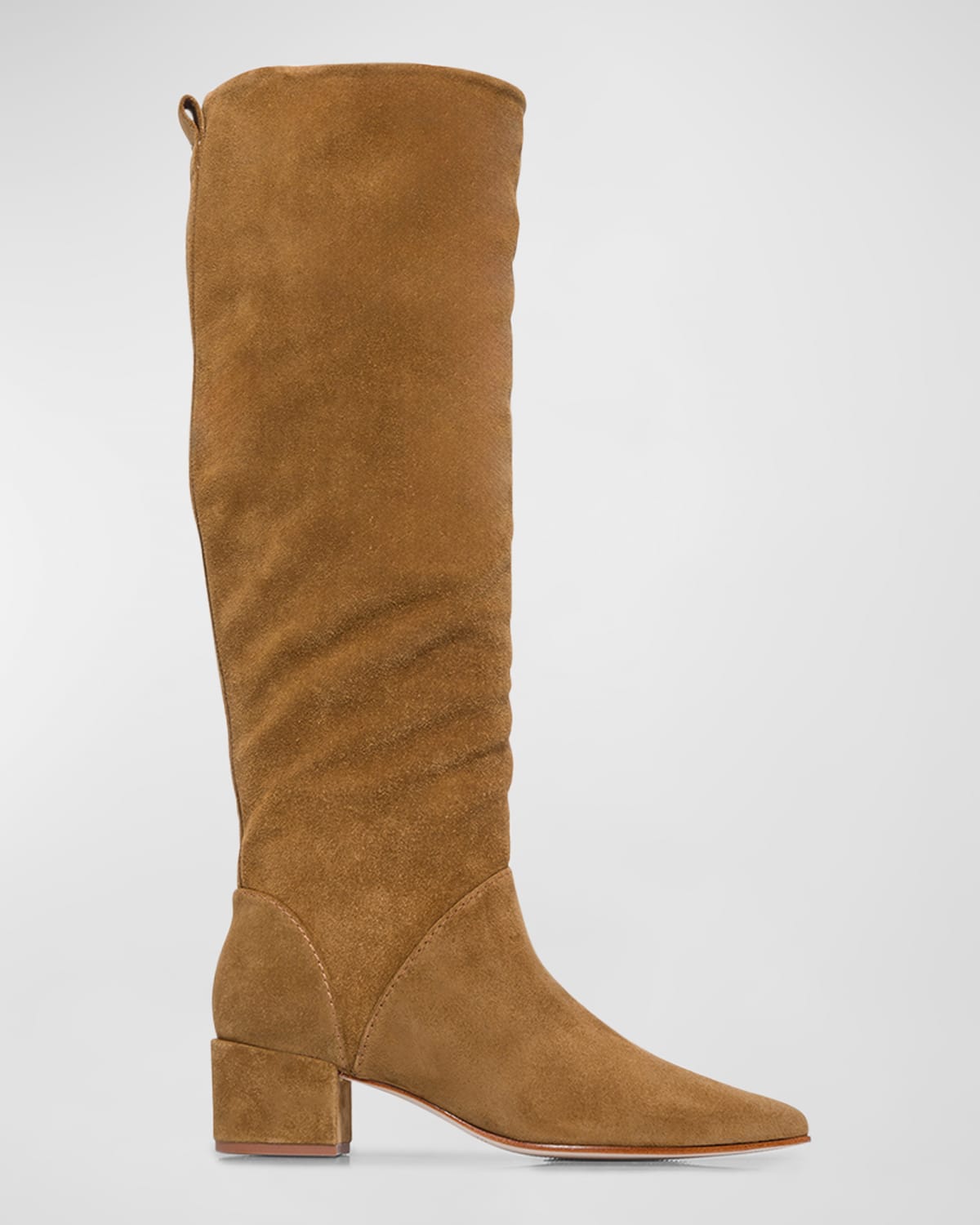 Bernardo "Milano" soft suede knee boots 1.75 in / 45 mm block heel Pointed toe Half zip eases dress Leather outsole Lining: Leather Professional cleaning recommended Made in Brazil
