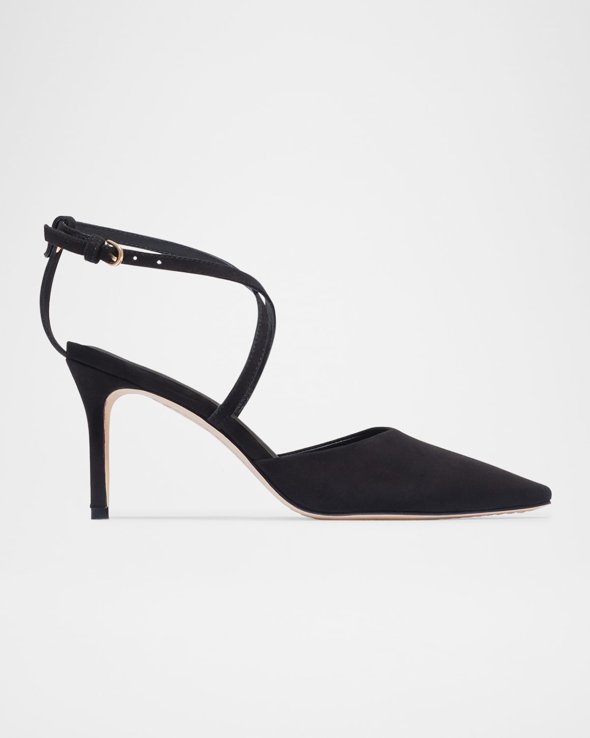The "Yazmin" suede heel by Bernardo features flattering crossover ankle straps on a slim stiletto. Designed for the woman who moves between moments, its feminine profile is ideal for both occasions and everyday sophistication. 3.25 in / 85 mm stiletto heel Pointed toe Crisscross vamp Adjustable ankle strap Leather outsole Lining: Leather Professional cleaning recommended Made in Brazil