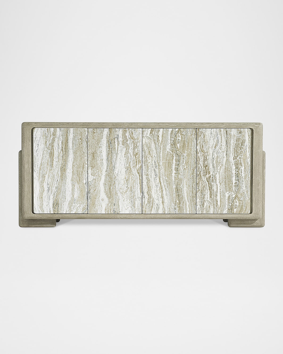 An elemental, serene design marks this stunning Arcadia Entertainment Credenza. The door fronts have faux stone overlays that mimic flowing woodgrain or swirls of natural marble. A tactile element is provided by a wirebrushed oak case. The base takes a unique approach with four supports that wrap up the sides of the credenza. Handcrafted of oak wood, oak veneers, and polyresin Four pulltoopen, softclose doors Behind left and right doors are adjustable shelves and grommet holes Behind center doors are a grommet hole, one softclose drawer, and fixed shelves Overall, approx. 80"W x 22"D x 34"T Antitip kit and instruction sheet included Adjustable glides Wipe clean Weight, 387.0 lbs Imported Boxed weight, approximately 397.8 lbs