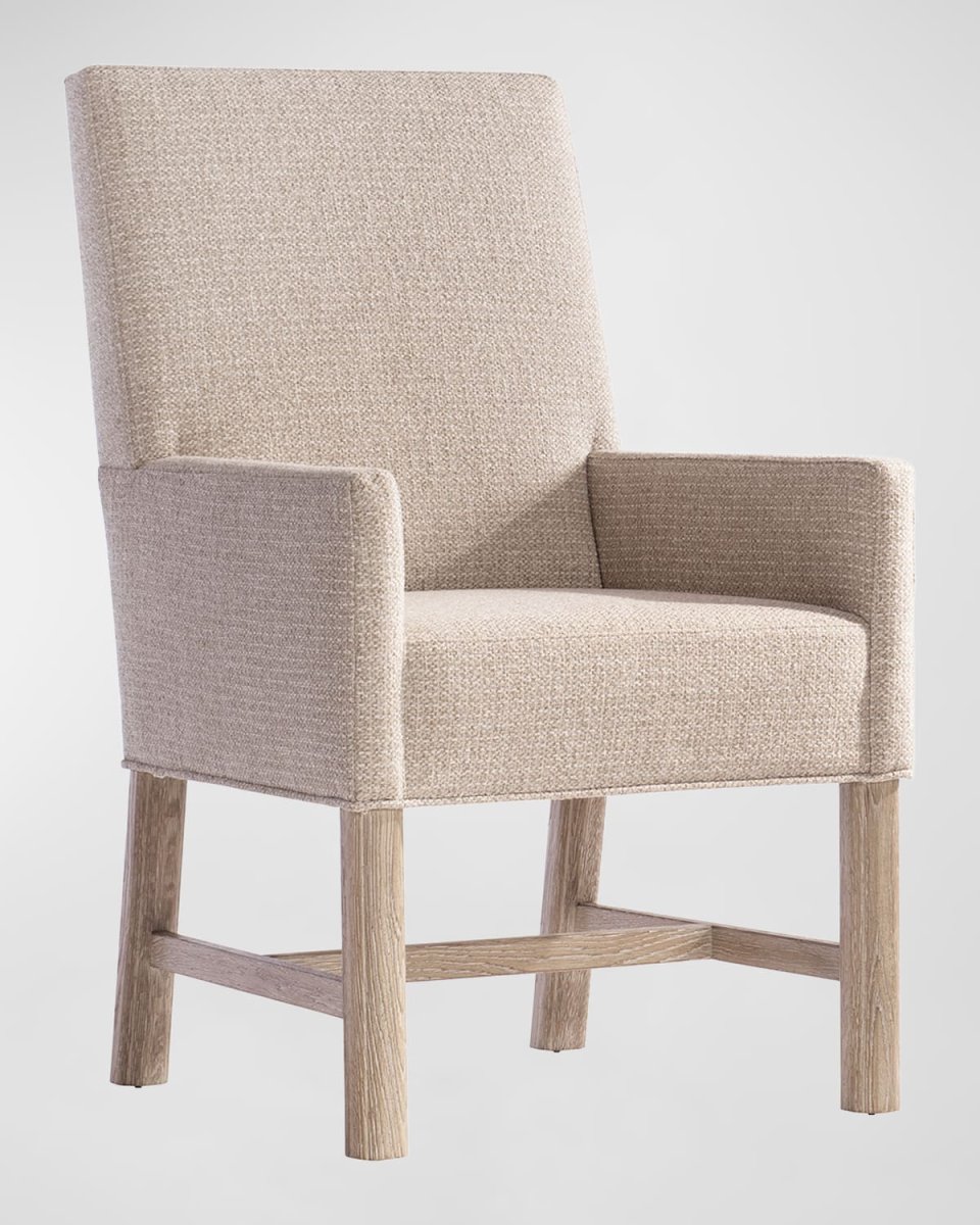 Gorgeous details and clean lines define the Aventura Arm Chair's traditional silhouette. The straight forms and corners of the seat and back are uniquely complemented with textured round legs in a marcona brown finish. Handcrafted of engineered hardwood and polyester Overall, approx. 25"W x 29.38"D x 41.63"T Seat, 20.5"W x 20.8"D x 19.6"T Arm height, 25.5" Finished back Weight, 37.5 lbs Imported Boxed weight, approximately 110.0 lbs
