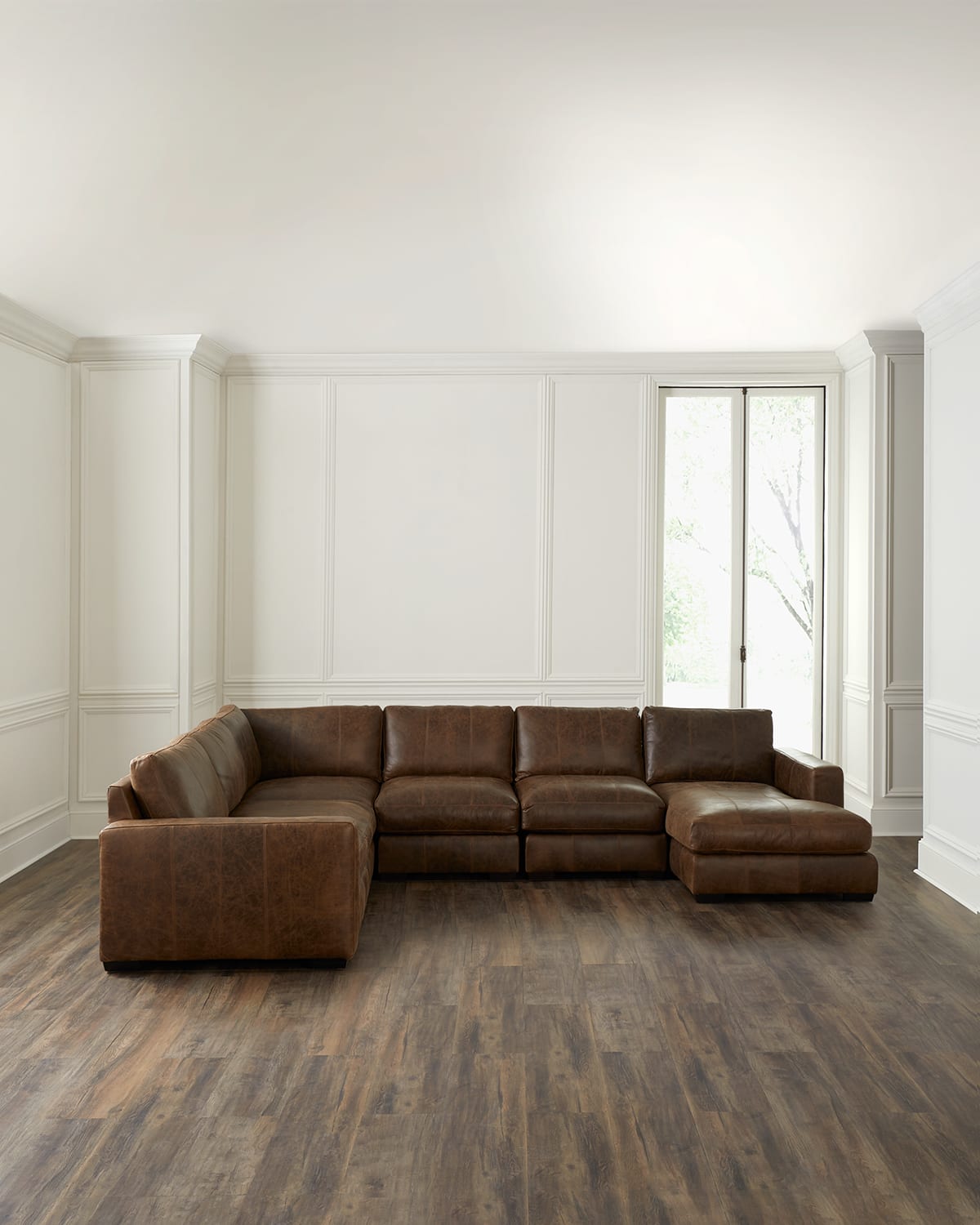 With a casual and comfortable sophistication, our Dawkins 5piece leather sectional features a thick, pebblegrained full aniline leather in matte brown Handcrafted sectional sofa includes right arm chaise, 2 armless chairs, corner, and left arm loveseat with connectors Upholstery, leather Frame, hardwood solids Piece 1, overall 137"W x 40.5"D x 37"T Piece 2, overall 107.5"W x 62.5"D x 37"T Seat width, 108" (piece 1), 100.5" (piece 2) Seat depth, 28" (piece 1), 49.5" (piece 2) Seat height, 18" Arm height, 23" Finished back Weight, 450.0 lbs 5piece set Imported Boxed weight, approximately 475.0 lbs