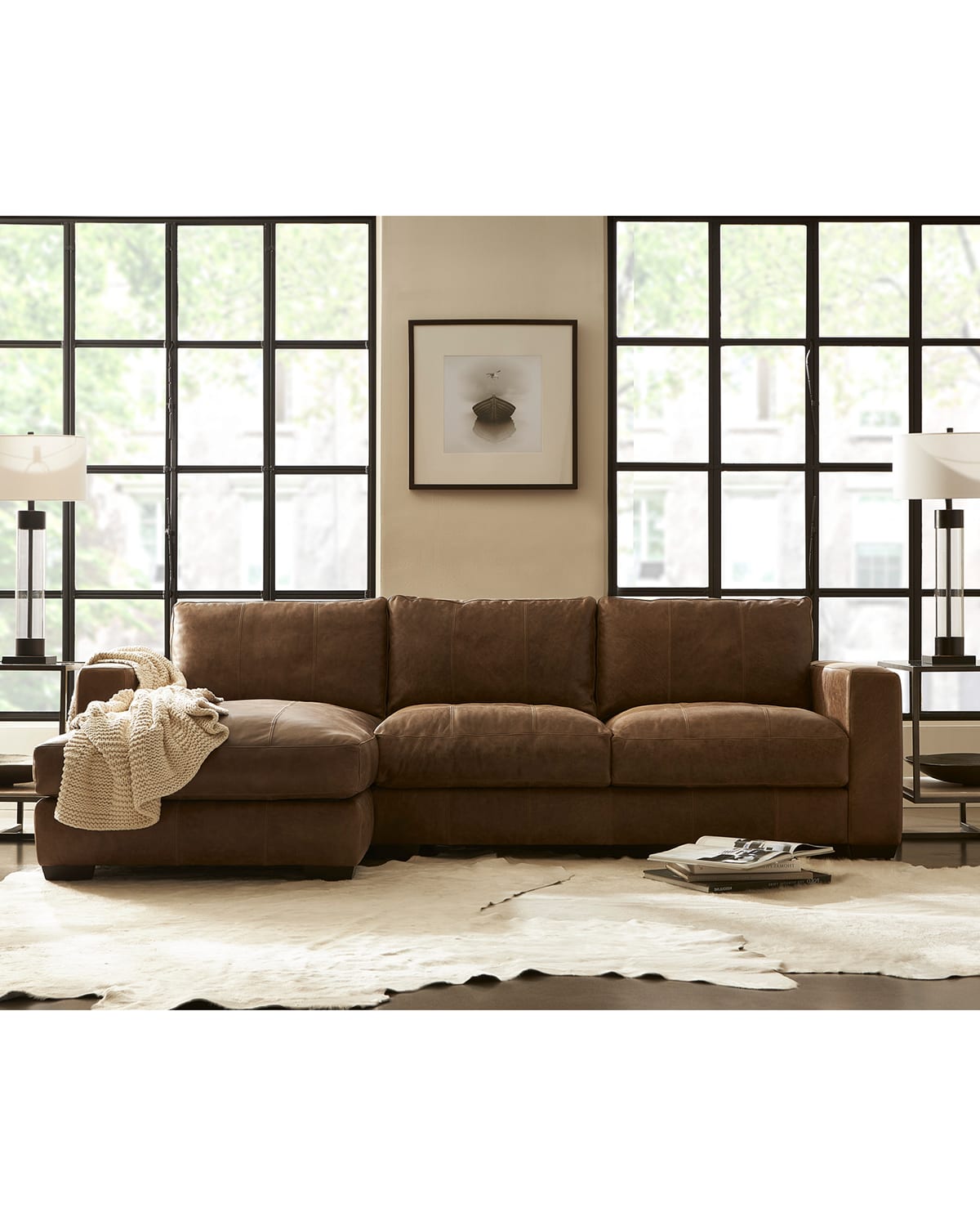 With a casual and comfortable sophistication, our Dawkins Track Arm Sectional features a thick, pebblegrained full aniline leather in matte brown Includes right arm loveseat and left arm chaise Upholstery, leather Frame, hardwood solids Piece 1, overall 103.5"W x 37"T Piece 1, 40.5"D Piece 2, 62.5"D Seat width, 90" Seat depth, 28" (piece 1), 49.5" (piece 2) Seat height, 18" Arm height, 23" Weight, 230.0 lbs 2piece set Imported Boxed weight, approximately 245.0 lbs