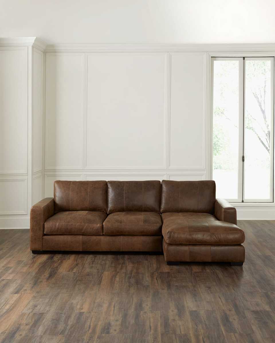 With a casual and comfortable sophistication, our Dawkins Track Arm Sectional features a thick, pebblegrained full aniline leather in matte brown Includes left arm loveseat and right arm chaise Upholstery, leather Frame, hardwood solids Piece 1, overall 103.5"W x 37"T Piece 1, 40.5"D Piece 2, 62.5"D Seat width, 90" Seat depth, 28" (piece 1), 49.5" (piece 2) Seat height, 18" Arm height, 23" Weight, 230.0 lbs 2piece set Imported Boxed weight, approximately 245.0 lbs