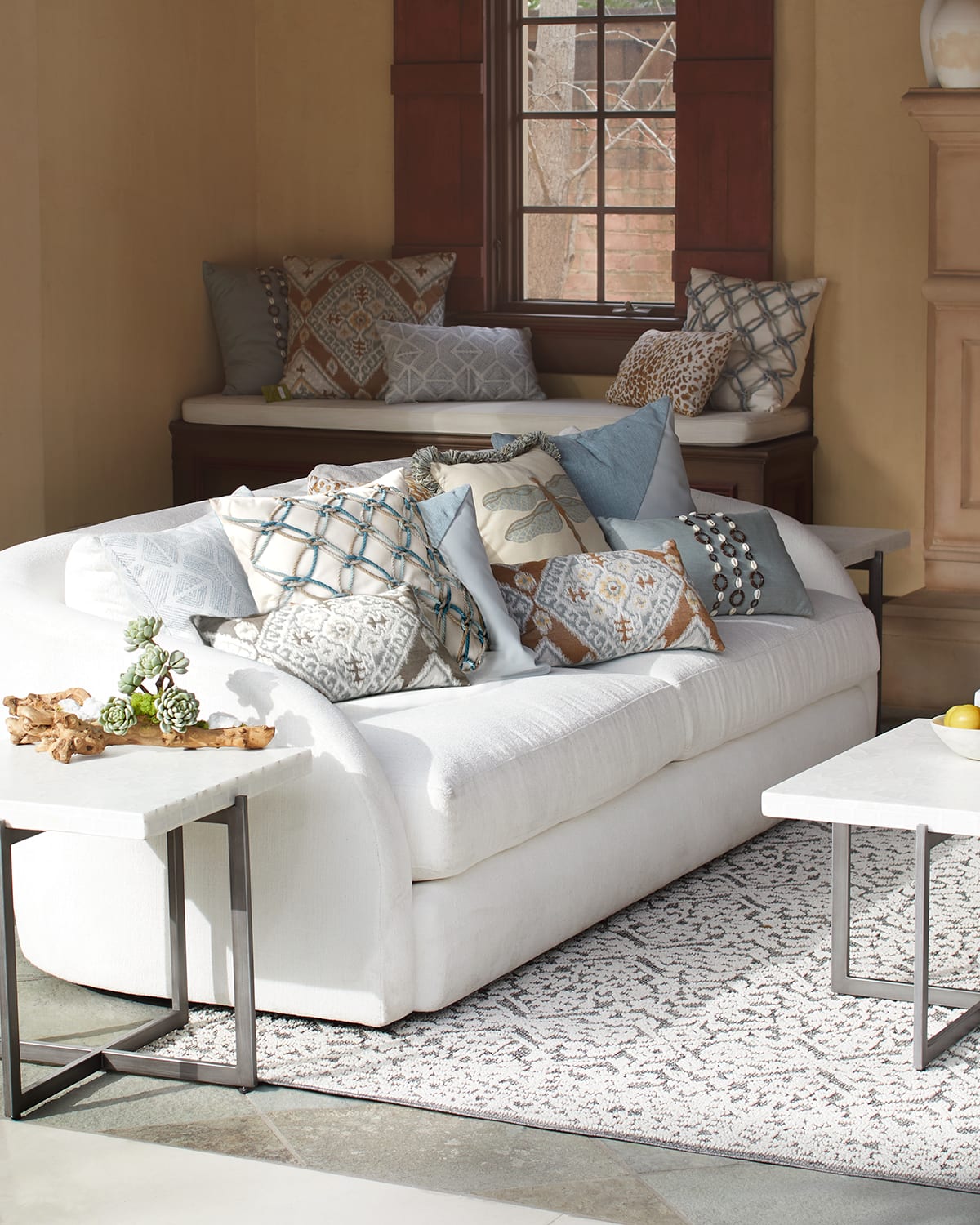 Handcrafted sofa features gracefully curved and tapered transition from back to arm Exterior plush cushion cores offer the ultimate luxe comfort Assembly not required For indoor and outdoor use Made of polyester Approx. 95"L x 42.0"W x 34"T Seat width, 88" Seat depth, 25" Seat height, 17" Made in USA Weight, 155.0lbs Boxed weight, approximately 160.0lbs