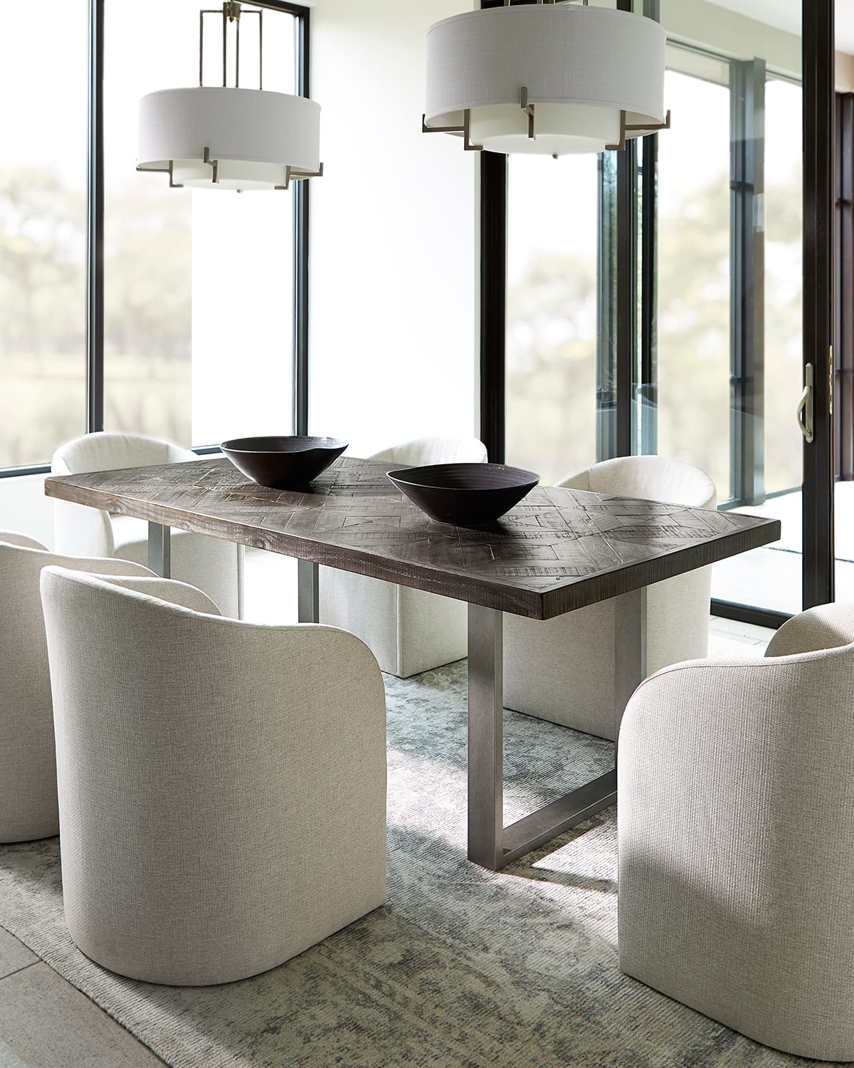 Inspired by urban living spaces, the Logan Square collection from Bernhardt Loft is casually sophisticated. The collection combines modern minimalism with a cool retro sentiment and 70's revival style. Architectural structure and clean lines combine with organic forms, textural details, and distressed pine in a moody palette of Cinder and Sable Brown. Bernhardt Loft is casual in nature and smaller in scale, but stylish and luxe with a fresh take on furnishings that reflect lifestyle, attitude, and individuality. The graceful shape of the Finch arm chair is highlighted by a richly textured and tailored fabric in Dove and nonmarring casters. Handcrafted construction. Polyester upholstery. Overall: 24"W x 22.8"D x 32.3"T. Seat: 21"W x 19"D x 19.3"T. Weight: 42 lbs. Imported. Boxed weight, approximately 46 lbs.