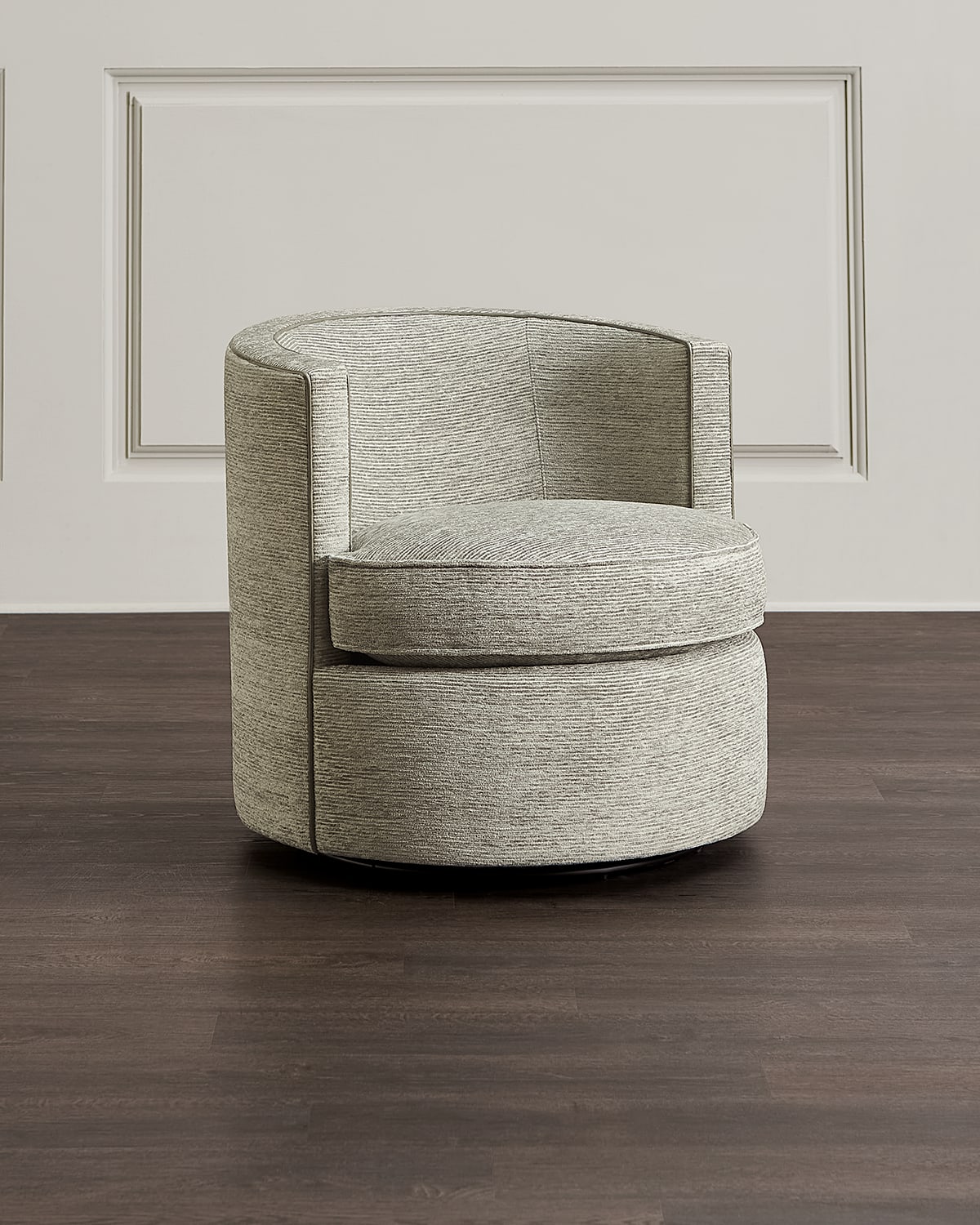 With sumptuous fabric and plush cushioning, the fleur swivel chair puts a modern spin on the traditional barrel style. Minimalist in form, it features tasteful welt trim for a tailored look. Seated on a discreet swivel base, this versatile chair delivers sophisticated style and luxurious comfort. Handcrafted of an engineered hardwood frame, polyester, steel swivel base, and poly down cushions Luxe down cushion, polyfoam core, polyester fibers, waterfowl feathers, waterfowl down Overall, approx. 30"W x 31"D x 30"T Seat width, 24.5" Seat depth, 23" Seat height, 18" Finished back Weight, 70.0lbs Made in USA Boxed weight, approximately 75.0lbs