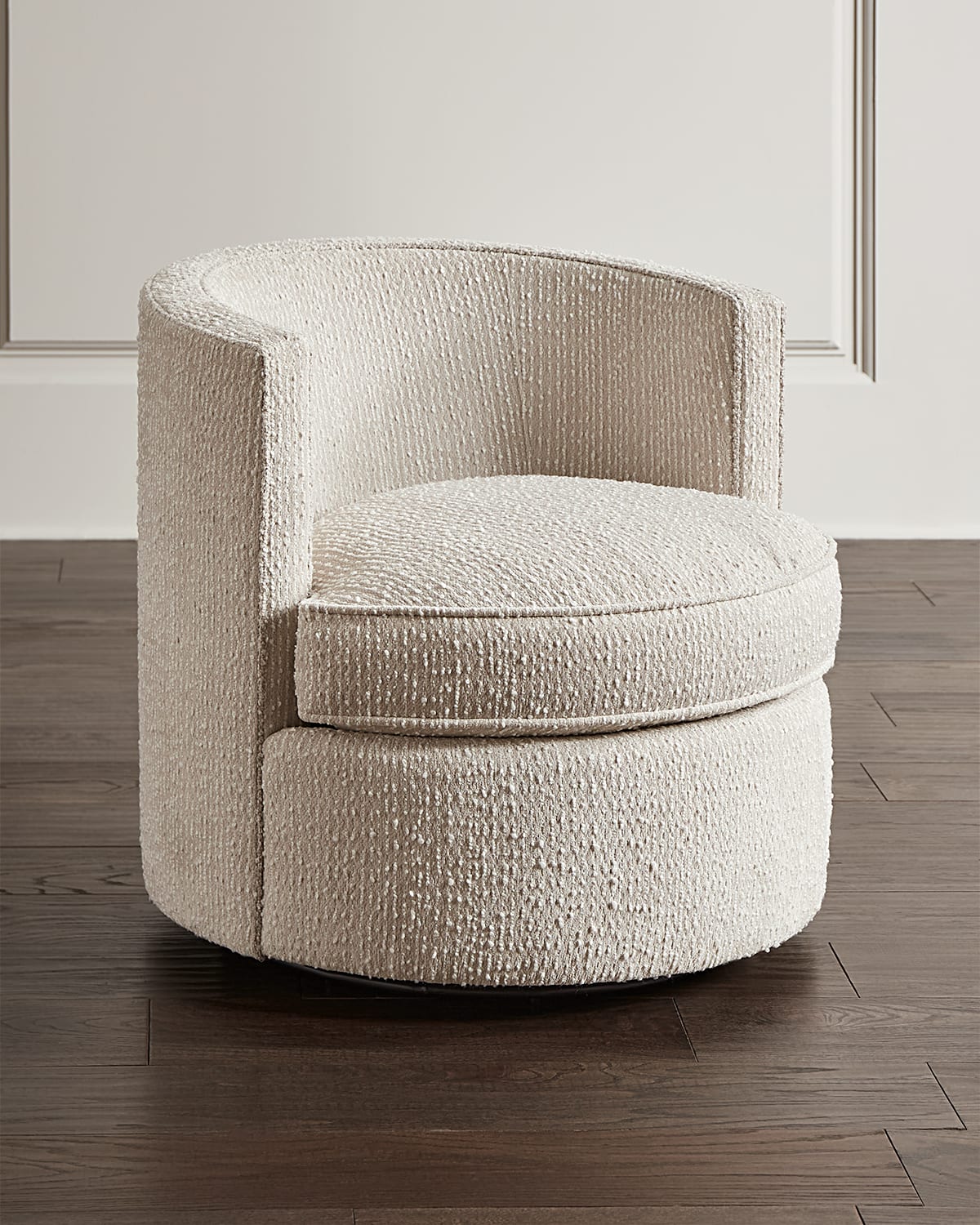 Tailored in an organic chenille in khaki with linear lines of boucle in cream, the handcrafted Fluer Swivel Chair features a tubstyle back and welted cushion with a luxe down core. Handcrafted of hardwood solids with welded steel swivel mechanism Upholstery, polyester Overall, approx. 30"W x 31"D x 30"T Seat, 24.5"W x 23"D x 18"T Arm height, 30" Weight, 70.0 lbs Made in USA from imported materials Boxed weight, approximately 75.0 lbs