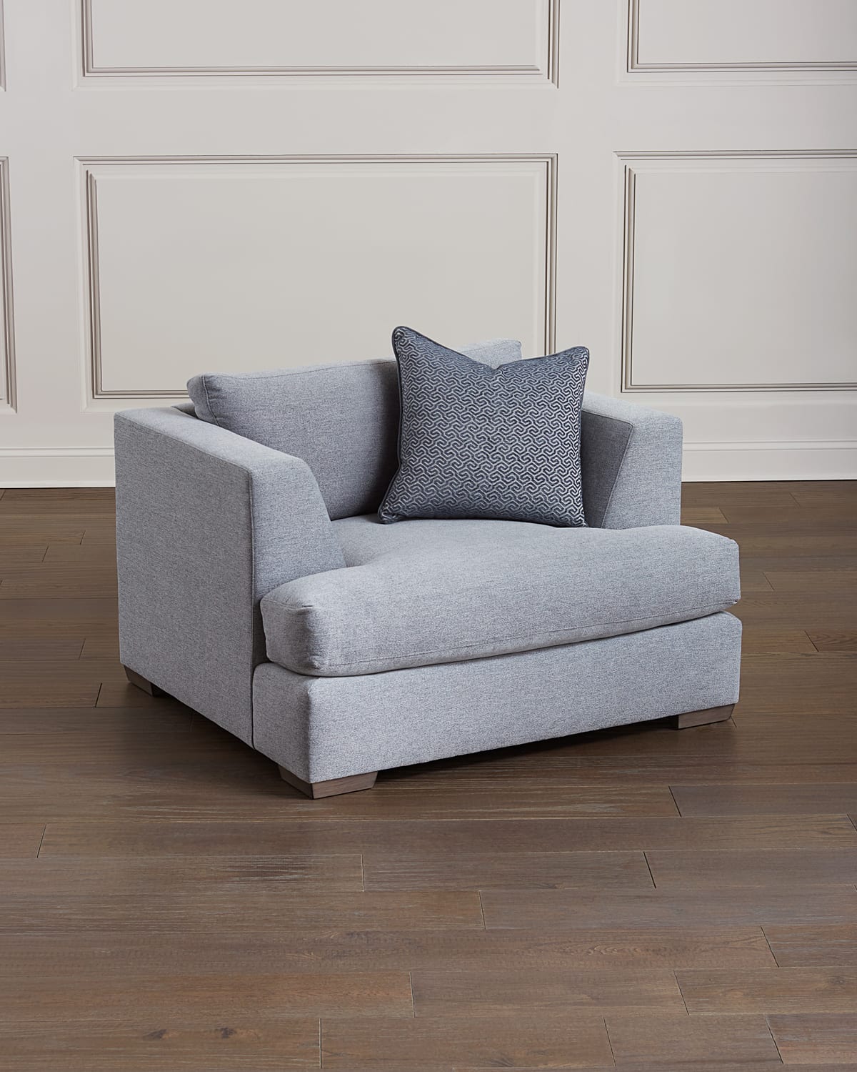 The Giselle chair features a European track arm in Blue Stone, with a Denim geometric blend down accent pillow. The Plush cushion cores combination of feather/down and foam was designed to be the most comfortable seat available. Handcrafted chair. Upholstery, polyester. Frame, hardwood solids. Overall, 46"W x 41.5"D x 33"T. Seat, 26"W x 26"D x 17.5"T. Arm height, 27.5". Imported. Boxed weight, approximately 90 lbs.