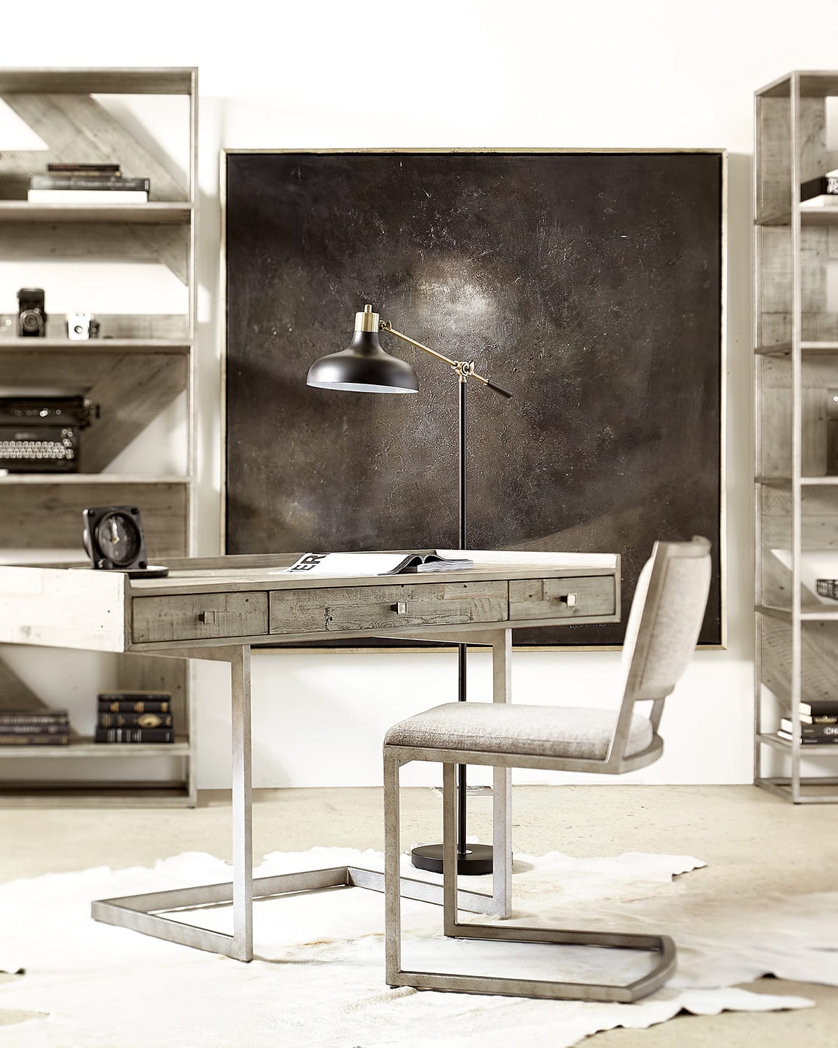 Handcrafted desk with Glazed Silver finished tubular steel base. Reclaimed solid pine drawers and top. Three drawers with steel pulls. Gallery rail around back and sides of the top. Welded steel frame; drawer box is mortise and tenon. Approx. 54"W x 24"D x 31"T. Light assembly may be required. Includes antitip kit. Weight: 119 lbs. Imported. Boxed weight, approximately 123 lbs.
