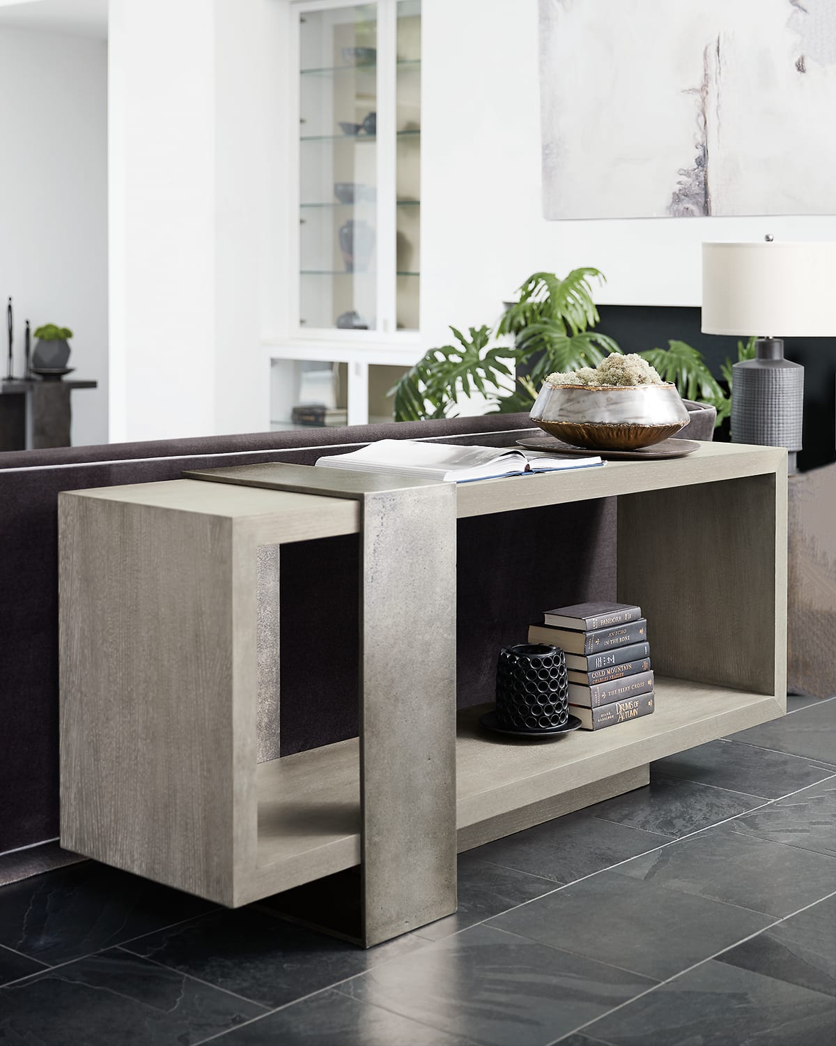 Handcrafted console table with plinth base. Wire brushed oak/cast aluminum. Open fronttoback case with one bottom fixed shelf surface. Cast aluminum wrapped across top and down front and back. Adjustable glides. Antitip kit included. Mortise and tenon/cast construction. 72"W x 19"D x 33.1"T. Imported. Boxed weight, approximately 206 lbs.