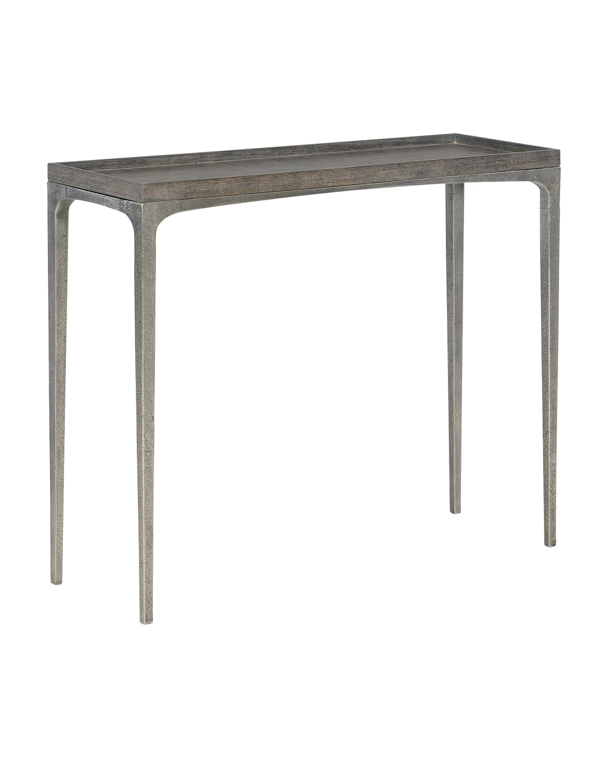 Handcrafted sofa table. Wire brushed oak. Fancy face top with gallery rails. Cast aluminum base. Adjustable glides. Mortise and tenon construction. 36"W x 12"D x 30"T. Imported. Boxed weight, approximately 29 lbs.