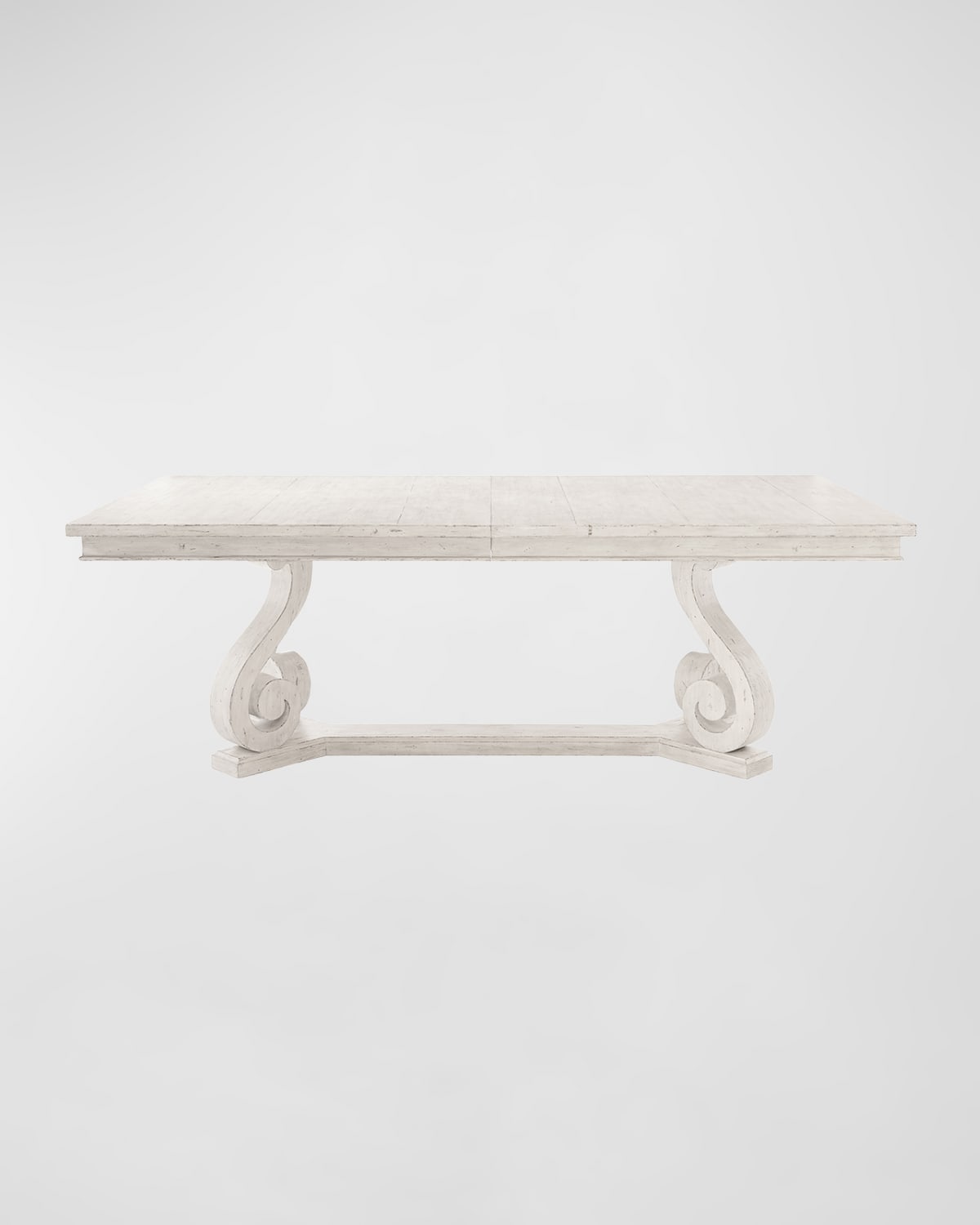 A fresh adaptation of French Provincial furnishings, the Mirabelle collection balances traditional neoclassic forms with efforts casual style. Elements of 17th century French design are refined and softened by a gently worn whitewashed finish. Designed on a larger scale, the collection frames shape and movement with a restrained simplicity and natural warmth. Rustic finishes mingle with formal silhouettes and intricate details. The look is sophisticated and dressy, but relaxed and inviting. Friends and love ones gather around. Finished in a distressed Cotton, our scrolled trestle based dining table extends to 124" with two 20" leaves. Handcrafted of pine. Approx. 84"W x 44"D x 30"T. Assembly required. Imported. Boxed weight, approximately 342 lbs.
