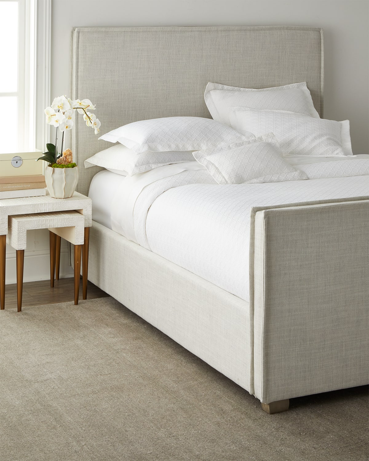 For an understated, organic look, this upholstered bed combines a simple modern form with textural fabric and thoughtful tailoring. Casual in nature and clean in style, our Saywer Upholstered Panel Bed features a double road of flanged welting down each side and across the top of the headboard and footboard. The fully upholstered bed is covered in muslin and wrapped in a textural fabric in a soft neutral shade for a soothing, organic look. Stitched flanged edges and wood feet in a morel finish add subtle nuances to this stylish but understated piece. Handcrafted of hardwood solids and upholstered in polyester/acrylic Five wood slat support system with adjustable center supports Overall, approx. 68.38"W x 88.63"D x 58.38"T Slat height, 7.19" Assembly required; includes hardware Ships in two boxes with white glove delivery Finished back Imported Total boxed weight, approximately 165.0 lbs