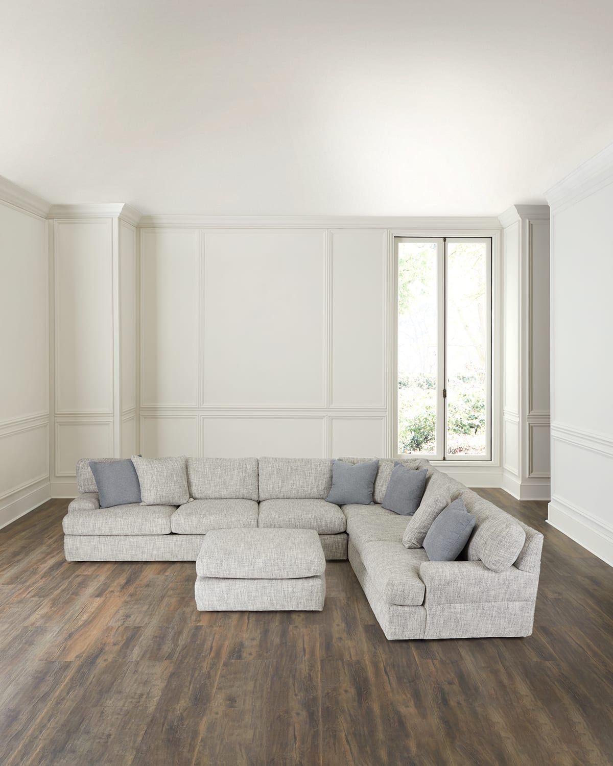 The Serena 4Piece Sectional includes a leftarm sofa, a rightarm sofa, one armless piece, and one corner piece. The included ottoman can be pushed against the sectional to turn either end into a chaise, or floating to use as a coffee table or footrest. Comes with three 22"Sq. heathered pillows (polyester/acrylic) and four 21"Sq. solid pillows (polyester) Handcrafted of engineered hardwood and polyester Polyester/down cushion fill Overall, approx. 204"W x 40.25"D x 34.5"T Seat, 21.25"D x 18.5"T Arm height, 25.5" Finished back Light assembly required to connect pieces with attached alligator clips Weight, 455.0 lbs Made in USA Boxed weight, approximately 510.0 lbs