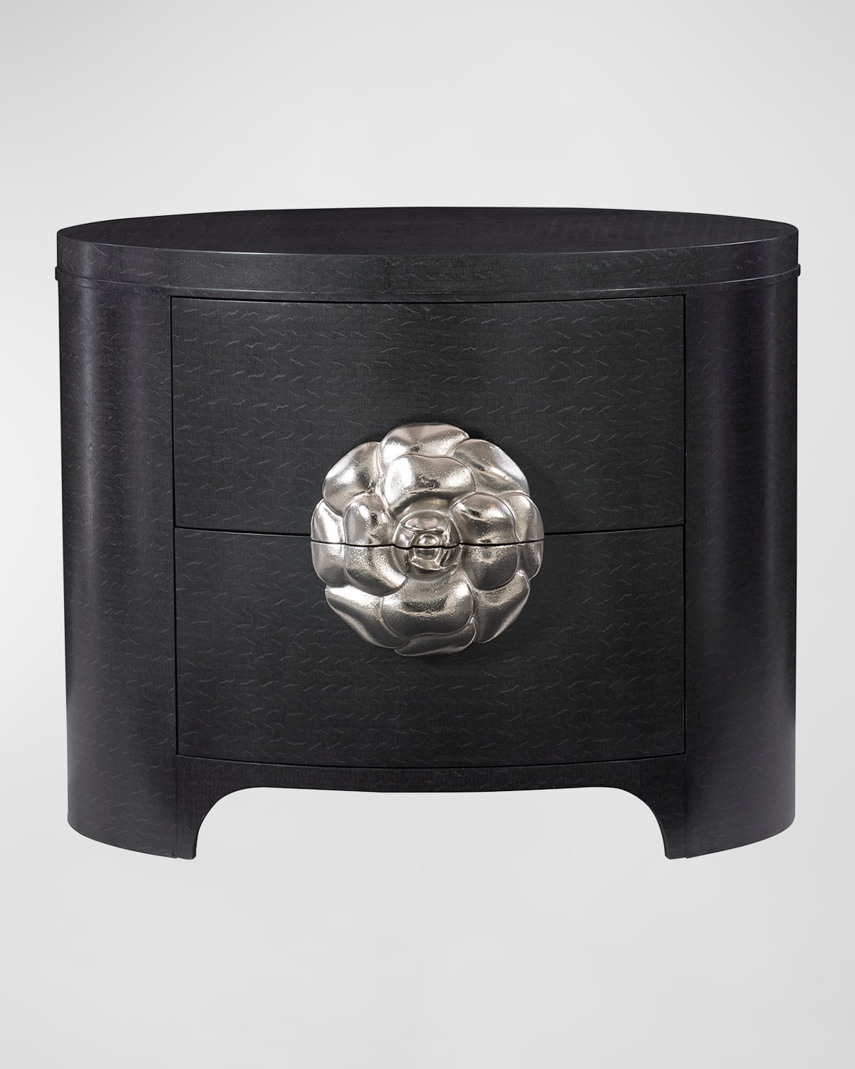 Oval shaping with a figured onyx top and flower hardware pulls add a strong and feminine feel to this nightstand Handcrafted nightstand is made of hardwood solids and aluminum Two softclosing drawers Adjustable glides Antitip kit Overall, approx. 35.25"W x 21"D x 28.5"T Not designed to support TV and/or other media Weight, 130.0 lbs Imported Boxed weight, approximately 135.0 lbs