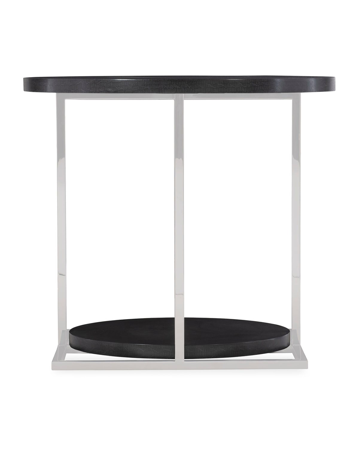 Handcrafted hardwood side table features a round top and shelves in onyx finished anigre Juxtaposed by the squareshaped boxed stainless steel frame Adjustable glides Includes hardware Assembly is not required Finished back Overall, approx. 28"W x 28"D x 25"T Imported Boxed weight, approximately 55.0lbs