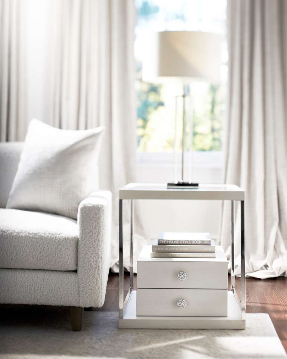 Handcrafted side table features woodframed top with inset tempered glass Polished stainless steel side frames and inset Two softclosing drawers with plated nickel hardware and inset kabebe shell pulls Adjustable glides Includes hardware Finished back Overall, approx. 23"W x 25"D x 25"T Imported Boxed weight, approximately 100.0lbs