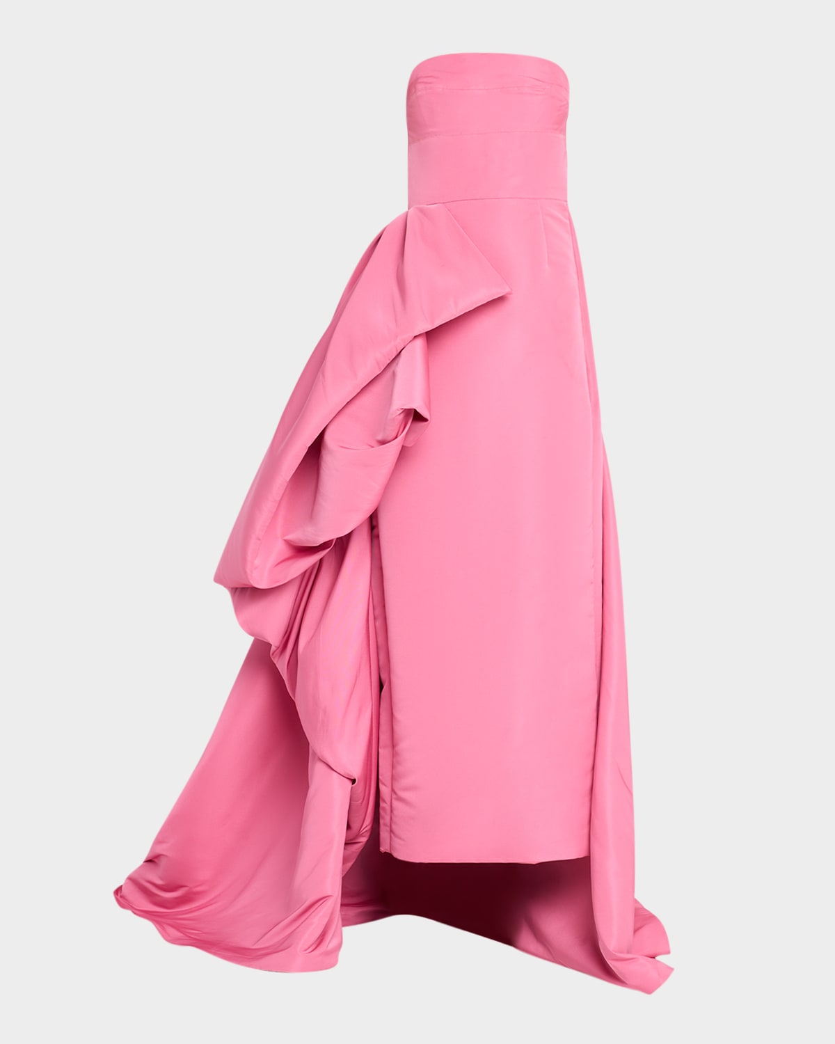 Bibhu Mohapatra "Camellia" gown in woven faille features a back cape gathered into a bubble floral appliqué Strapless neckline Sleeveless Highlow, anklelength hem Aline silhouette Invisible back zipper Polyester/cotton Made in the USA
