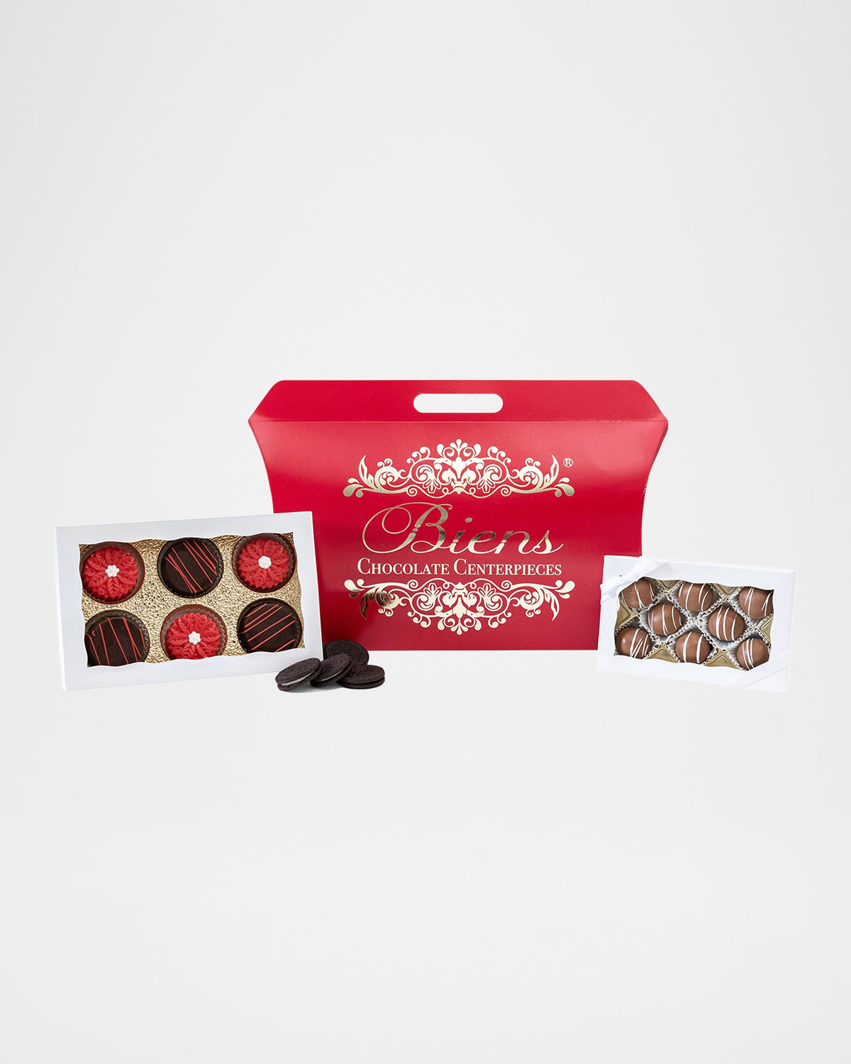 Embrace the enchantment of the holiday season with the Poinsettia Custom Oreo amp; Bien Tote Box, a gourmet indulgence crafted to share festive joy. This artisanal collection features six decadent, chocolatecovered sandwich cookies and eight decadent chocolatedipped Biens. Perfect as a thoughtful gift or a stylish addition to your holiday gatherings, these cookies offer a sweet tribute to cherished traditions. Presented in a sophisticated pursestyle box, they make a stunning impression, embodying the spirit of Christmas in every exquisite detail. Includes 3 striped sandwich cookies, 3 poinsettiathemed sandwich cookies, and 8 Biens Bien shelf life: 2 weeks without refrigeration or frozen for one month Sandwich cookie shelf life: up to one month Gift box, approx. 18"W x 4"D x 14"T Net Weight: 56 oz./ 3.5 lbs. Made in USA