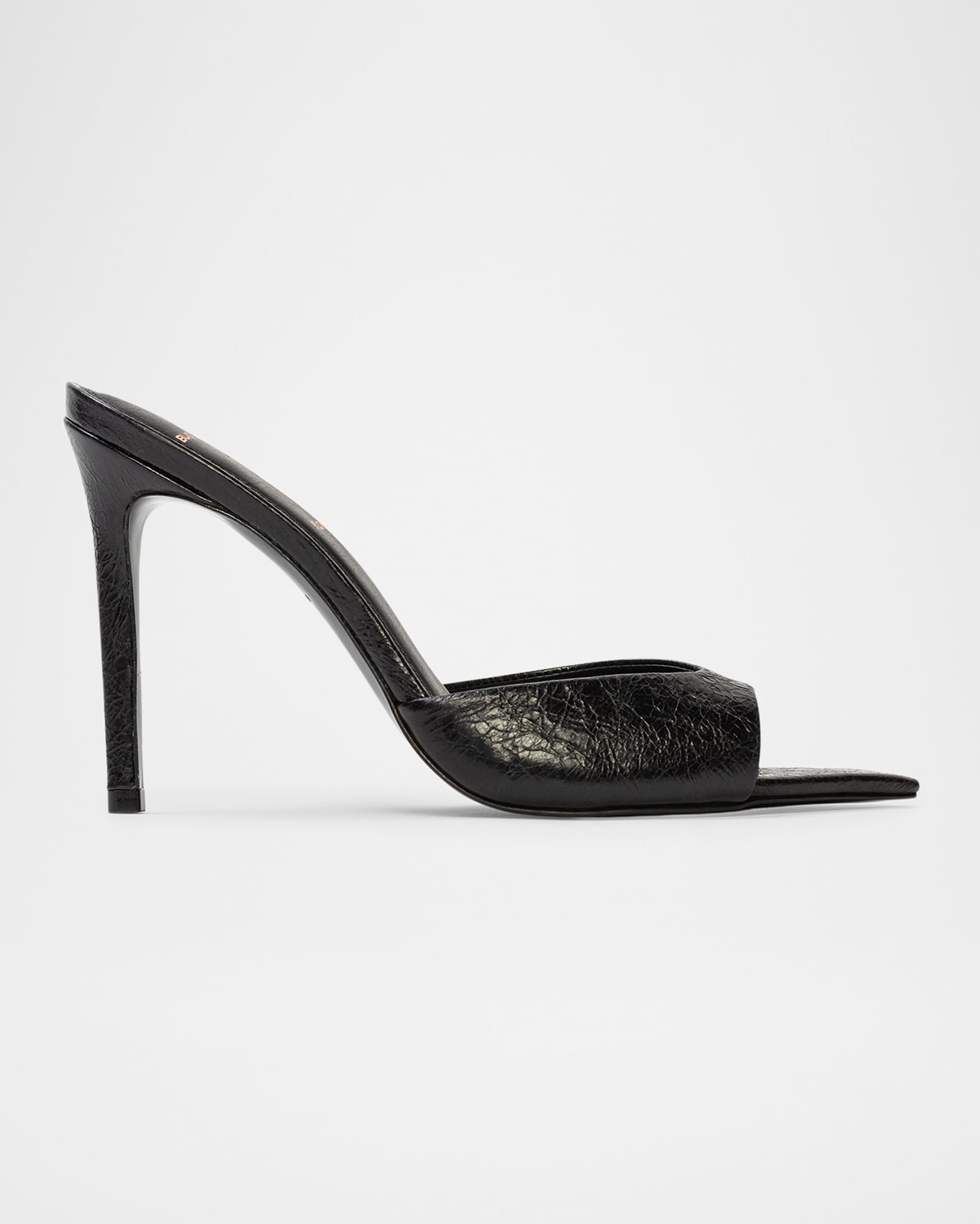 Black Suede Studio "Brea" patent leather mule sandals 4.00 in / 100 mm stiletto heel Open toe Slide style Leather outsole Lining: Leather Made in Brazil