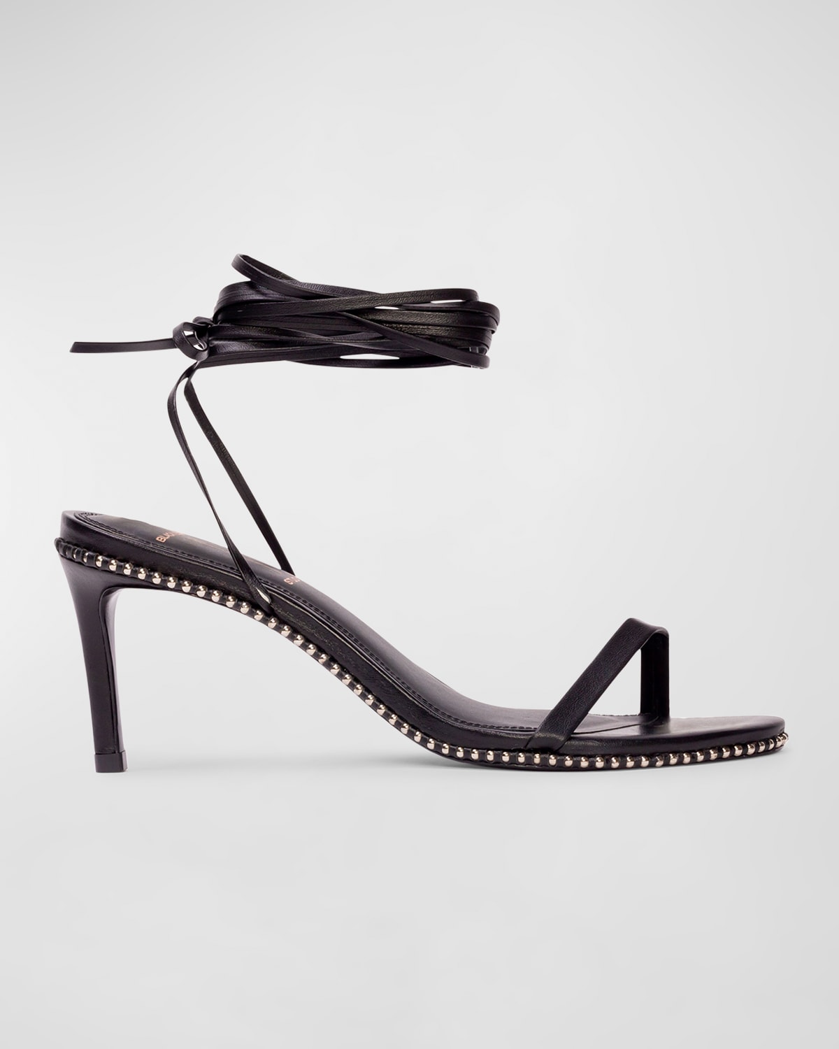 Black Suede Studio calf leather sandals with micro stud detailing 2.50 in / 65 mm kitten heel Open toe Adjustable ankle ties Leather outsole Lining: Leather Professional cleaning recommended Made in Brazil