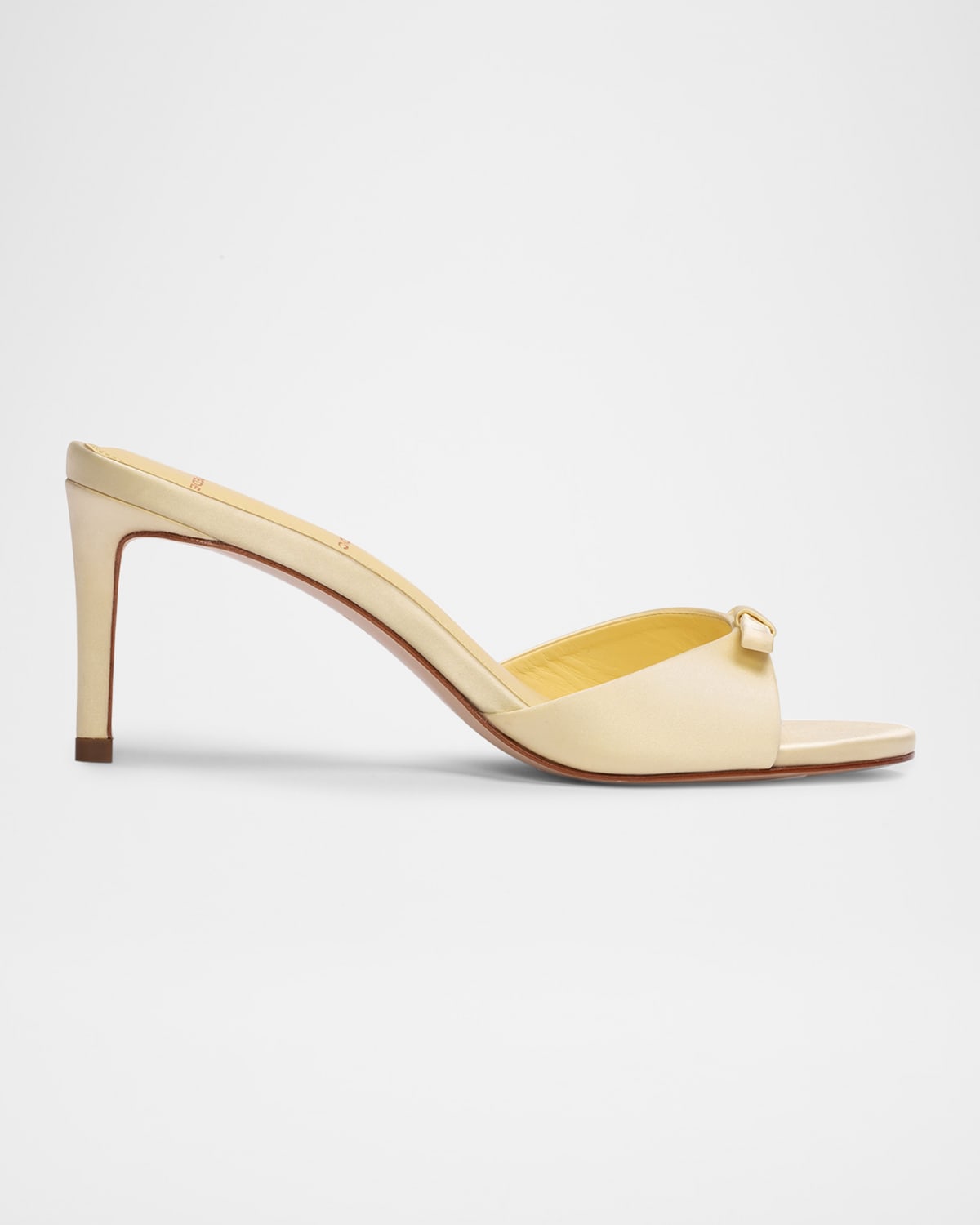 Black Suede Studio satin mule sandals with delicate bow accent 2.50 in / 65 mm stiletto heel Open toe Slide style Leather outsole Lining: Leather Professional cleaning recommended Made in Brazil