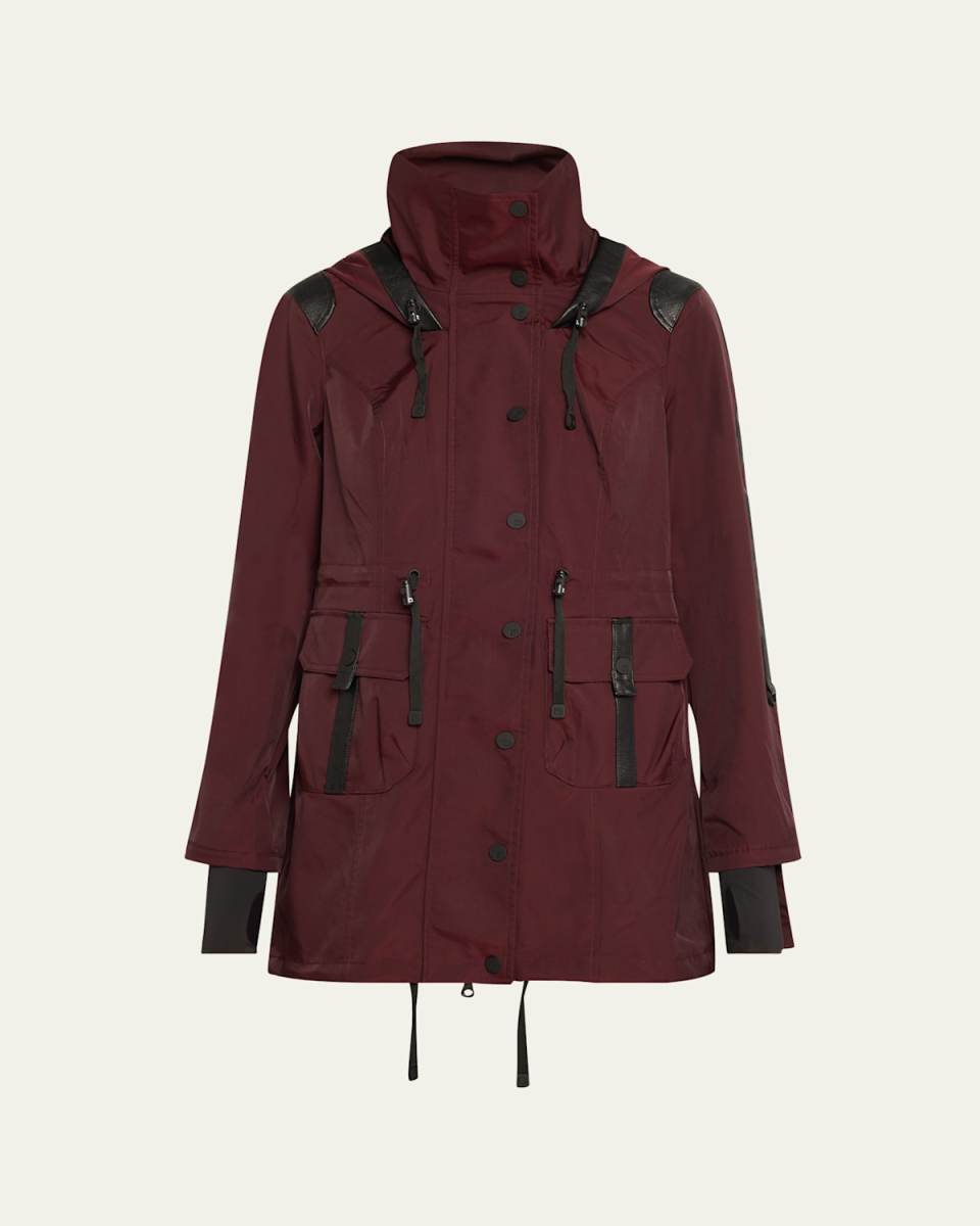 Blanc Noir "Aurora" effortlessly stylish and versatile anorak jacket with faux leather (polyurethane) trims Hooded neckline; front zip/snap placket Long sleeves; storm cuffs Adjustable drawstring waist Front flap pockets with snap closures Midlength Relaxed fit Polyester/nylon/polyamide/spandex Made in USA