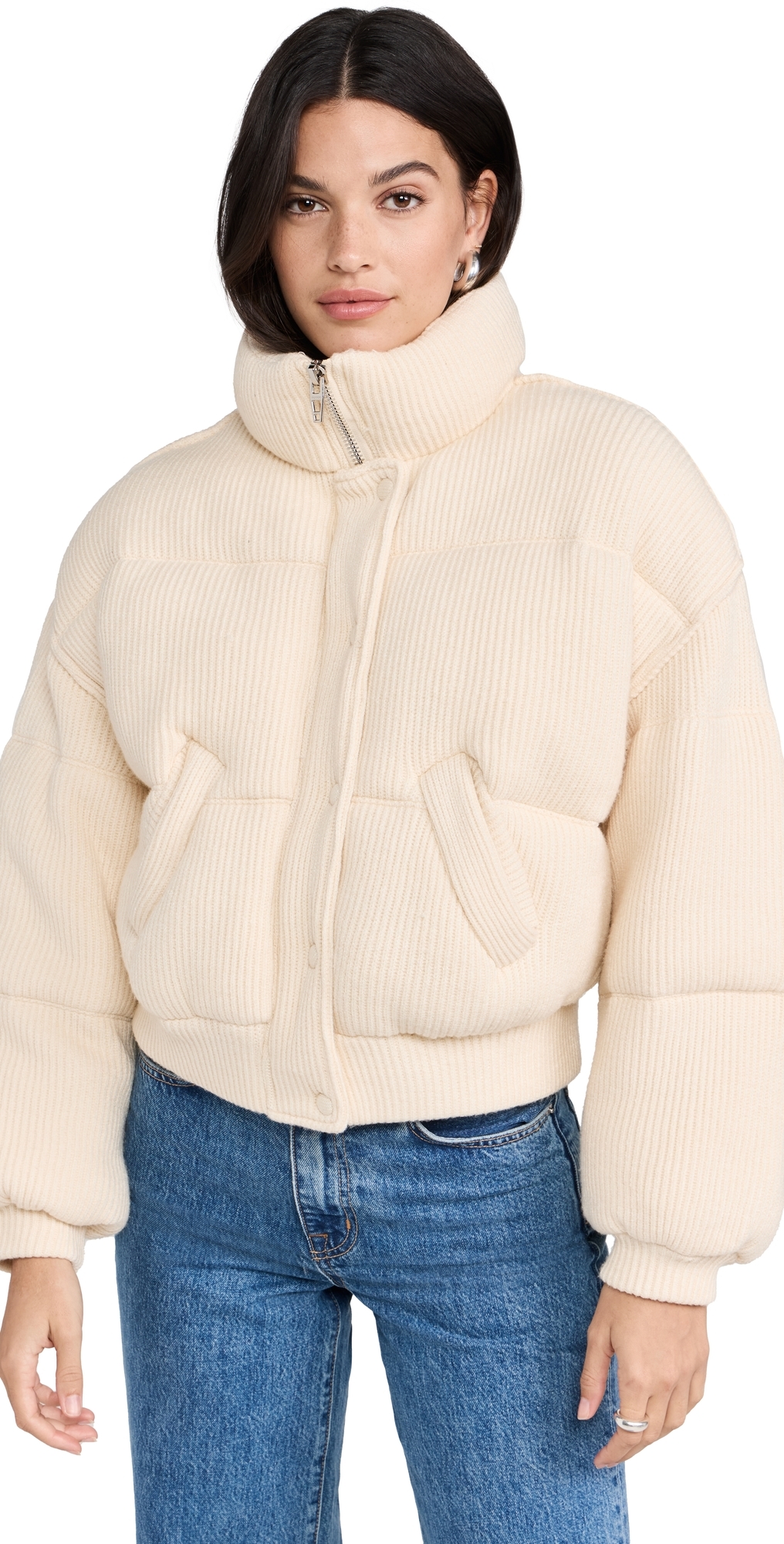 Fabric: Heavyweight quilted knit. Cropped profile. Collared neck. Long sleeves. Snap flap and hidden zip placket. Slant hip pockets. Shell: 50% viscose/30% polyester/20% nylon. Lined. Lining: 97% polyester/3% spandex. Fill: 100% polyester. Dry clean. Imported, China. Measurements: Measurements from size S Length: 19.75in / 50.0cm, from shoulder