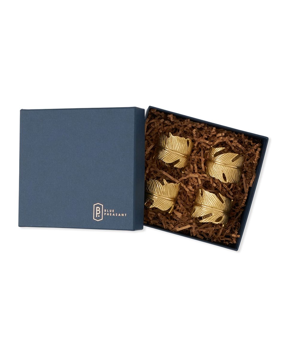 Feathershaped napkin rings made of brass. Set of four; each 2"L x 2"W. Imported.