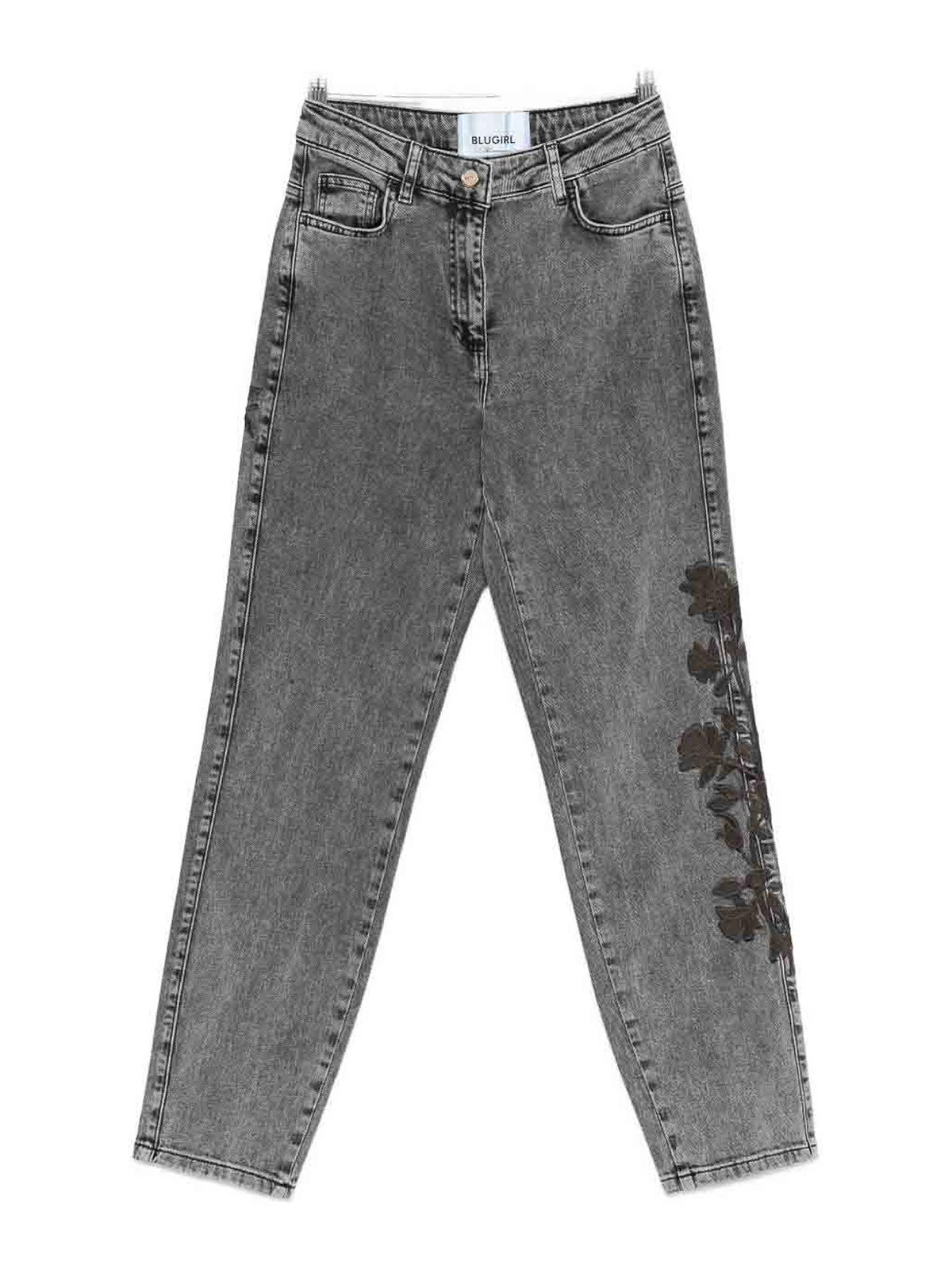 Ornement floral gris brodé à cinq poches, braguette boutonnée, jambe droite, effet acide