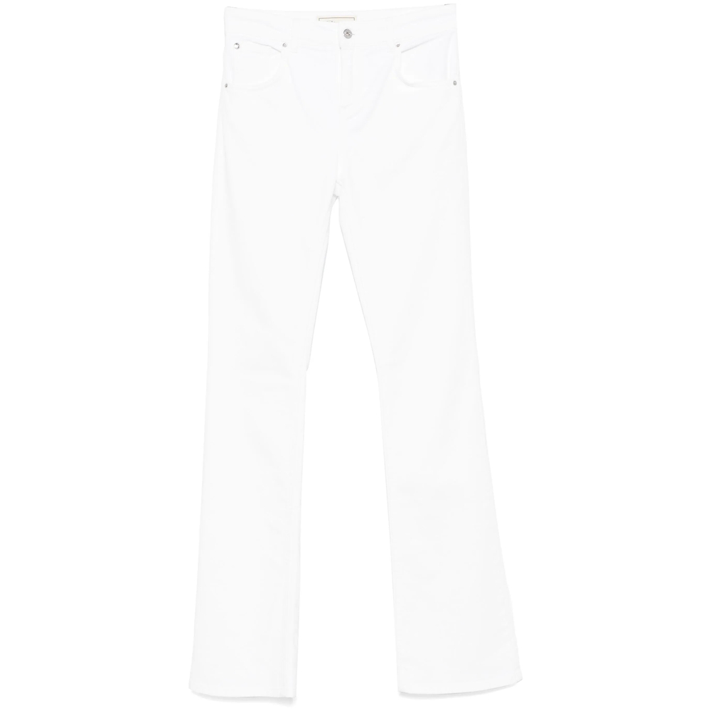white front button and zip fastening classic five pockets belt loops logo patch to the rear