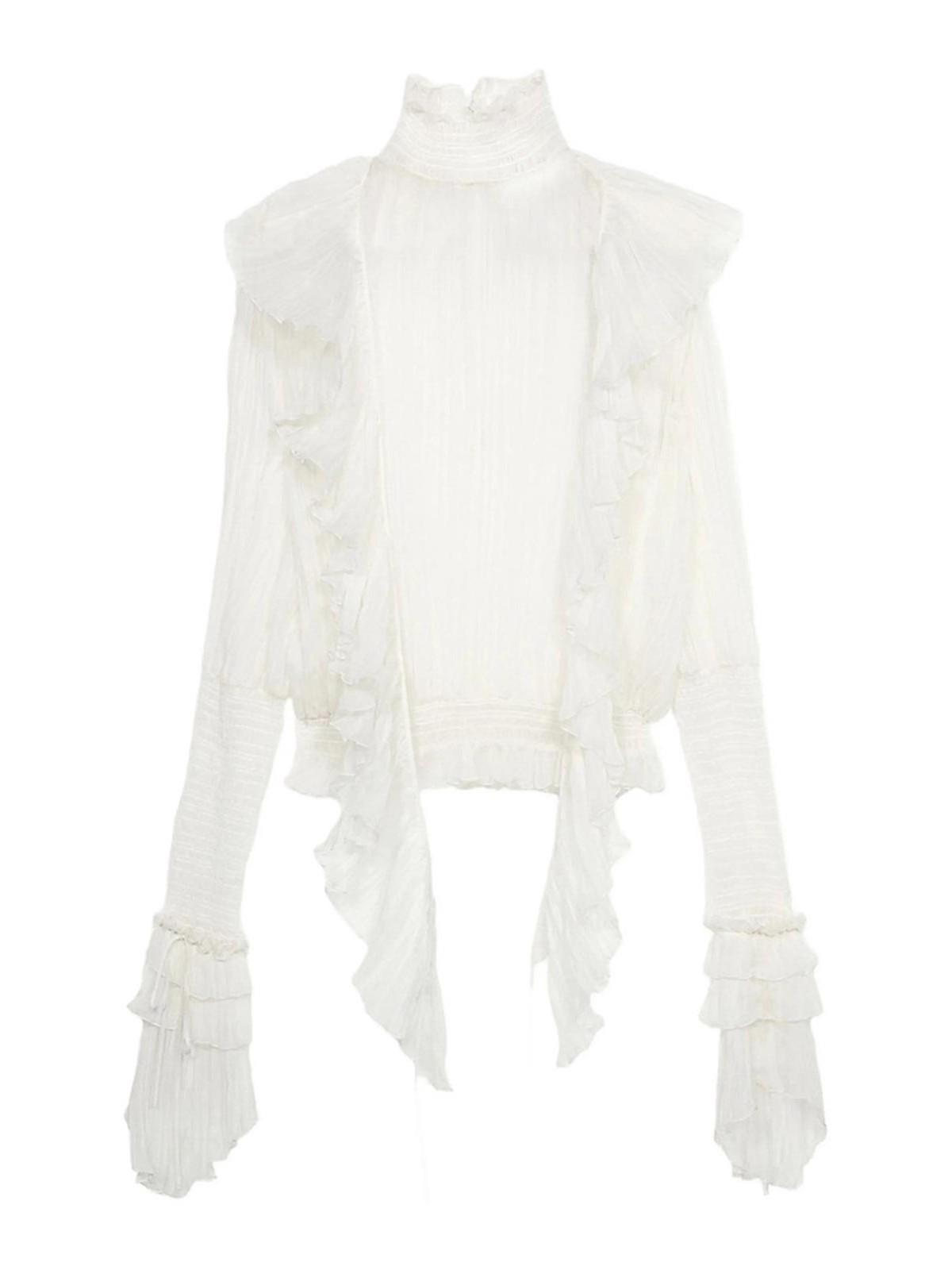 Texture plissée blanc cassé, col haut, détails volantés, manches longues et poignets smockés