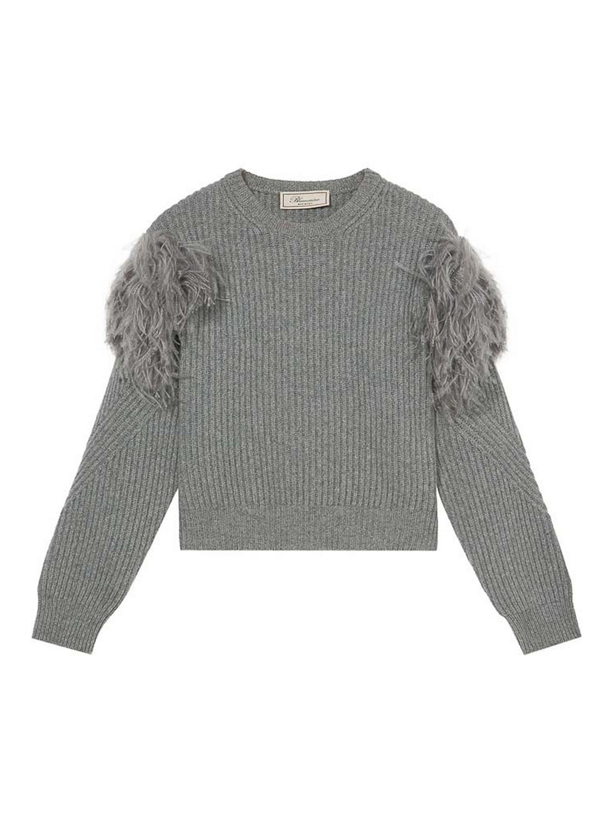 Design en maille côtelée grise avec détails sur les manches, encolure ras du cou, manches longues