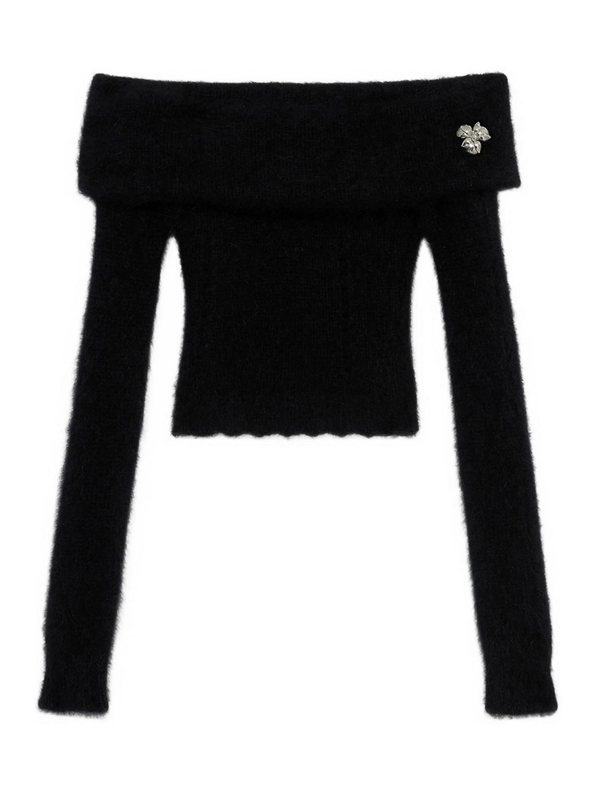 Encolure à épaules dénudées et appliqués floraux noirs, manches longues, tricot duveteux