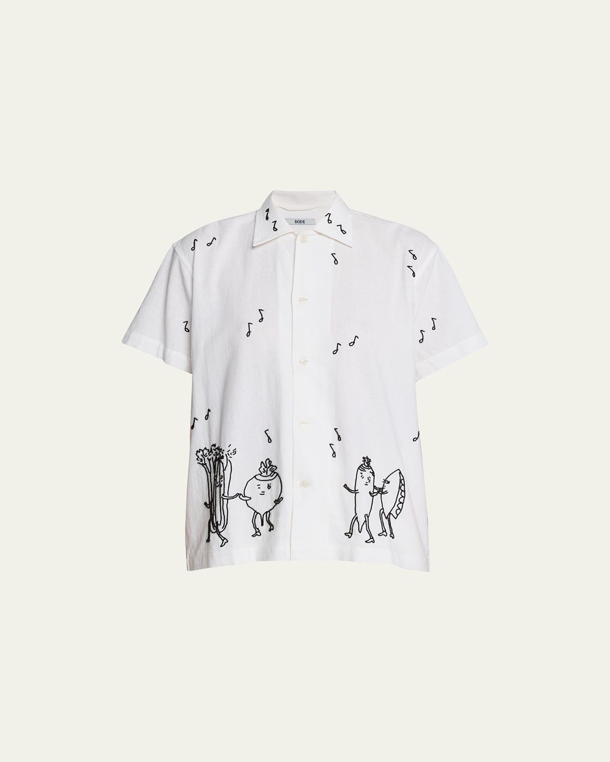 Bode "Dancing Pantry" shirt with bead embellished motf Spread collar; button front Short sleeves Boxy fit Cotton Dry clean Imported