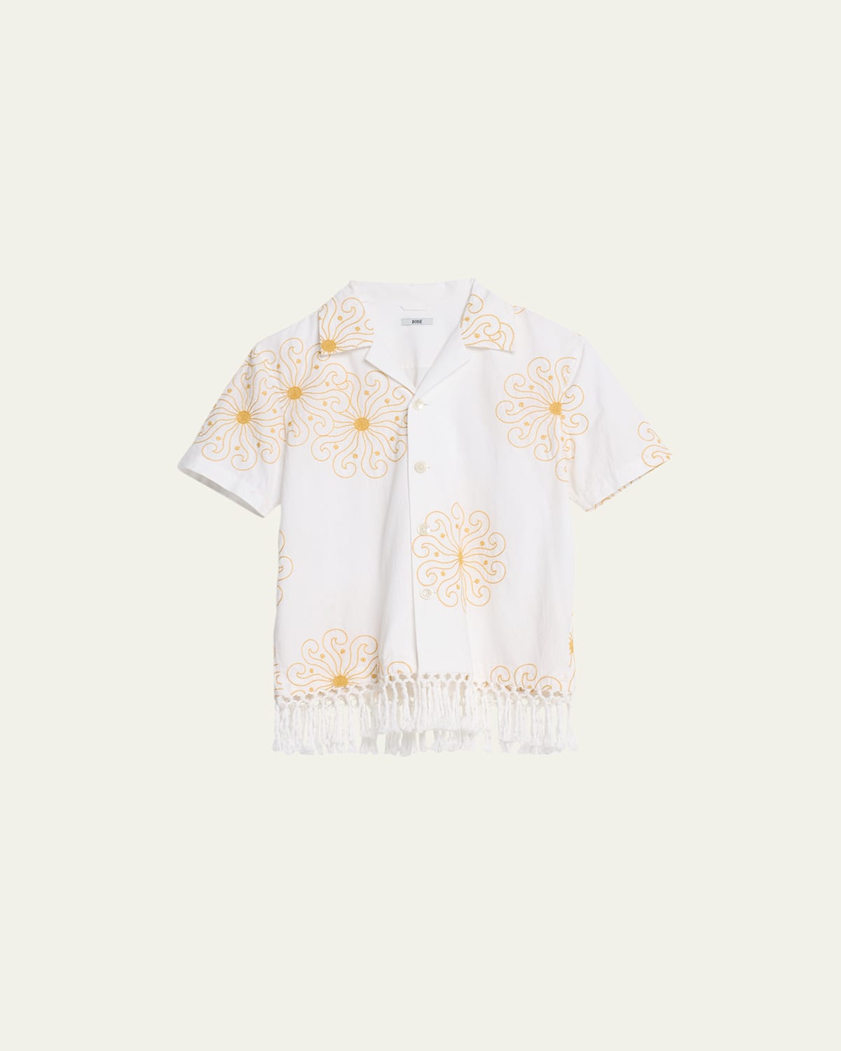 Bode "Soleil" shirt features sunburst embroidery Notch lapel; button front Short sleeves Boxy fit Fringe hem Cotton Dry clean Imported