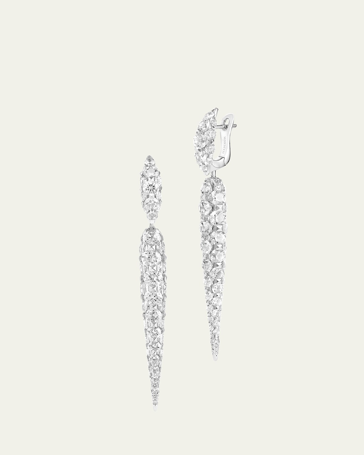 The colorless diamonds of these Boghossian earrings gently hang like iridescent icicles. The sharp icicle earrings are crafted using the brand's unique Merveilles technique, so precious diamonds are arranged with almost invisible settings. Polished 18karat white gold Graduating white diamonds 11.06 total diamond carat weight Leverback closure eases dress For pierced ears Made in Switzerland