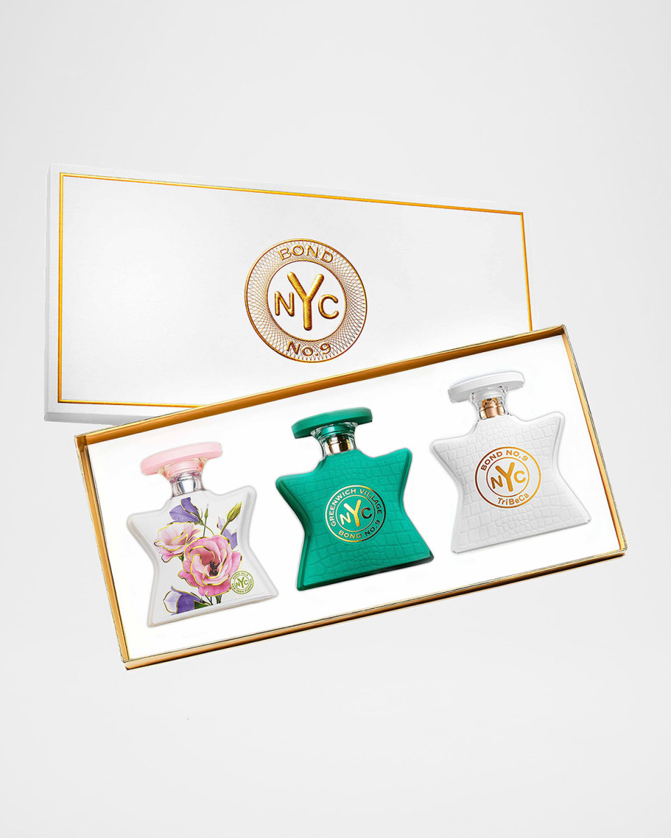 A trio (50mL each) of our most popular women's fragrances. This is the perfect item to explore Bond No. 9's bestselling eau de parfum. Packaged in a chic, white luxe box embellished with Bond's gold token logo, the set contains our topselling Greenwich Village, New York Flowers, and Tribeca eau de parfums. GREENWICH VILLAGE Notes: Cassis, Lychee, Mandarin, Peony, Waterlily, Patchouli, Jasmine Petals, Ambrox, Peach Musk, Vanilla, Oak Moss, and Praline NEW YORK FLOWERS Top Notes: Anjou Pear, Clementine. Kir Royal Accord, Ivy Leaves Middle Notes: Rose de Grasse, Tuberose, Star Jasmine Base Notes: Amber, Florentine Iris, Musk TRIBECA Notes: Cacao Absolute, Green Hazelnut, Jasmine Sambac Absolute, Cedarwood, Ambroxan, Moss, Caramel 3 x 1.7 oz. / 3 x