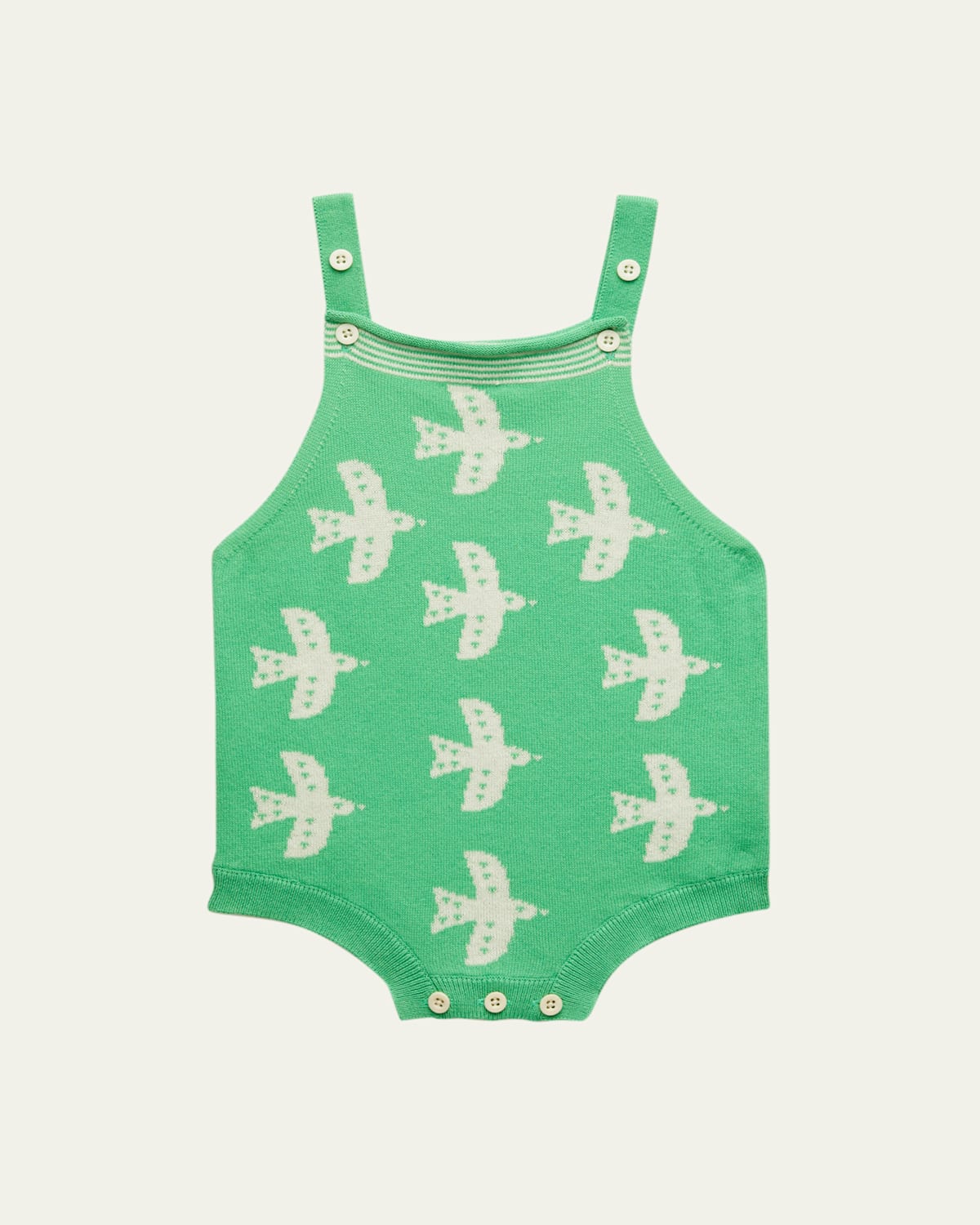Bonniemob "Bird" romper with flying birds intarsia at front Square neckline Sleeveless Button closures at front Button gusset Fully GOTS certified Organic cotton Imported