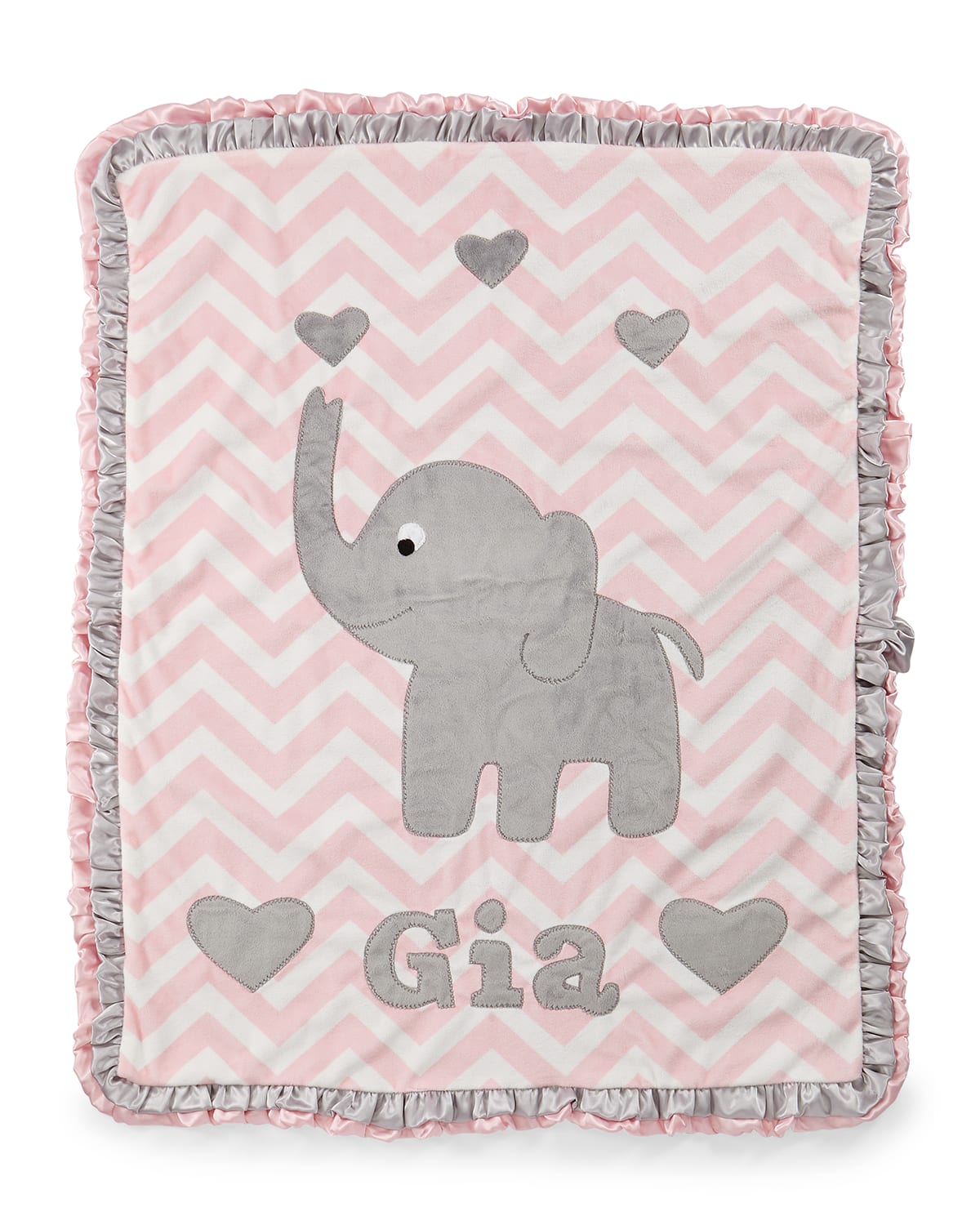 Boogie Baby microfiber blanket in chevron print. Personalize with embroidery (up to 11 letters) in style shown. Elephant appliqué on front. Layered ruffle edge. Approx. 40"H x 34"L. Cotton; machine washable. Made in USA of imported material.
