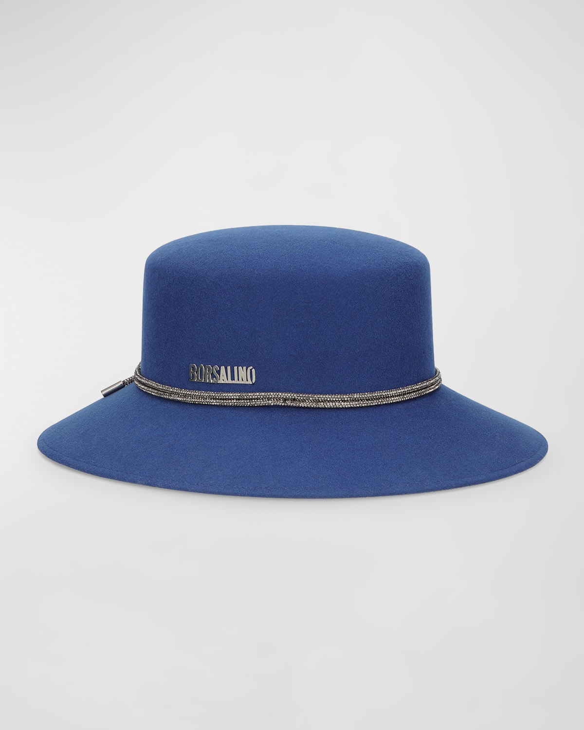 Borsalino "Lana" fedora hat made of wool Features a side logo plaque Flat crown Slightly downturned brim Rhinestoneembellished band Made in Italy
