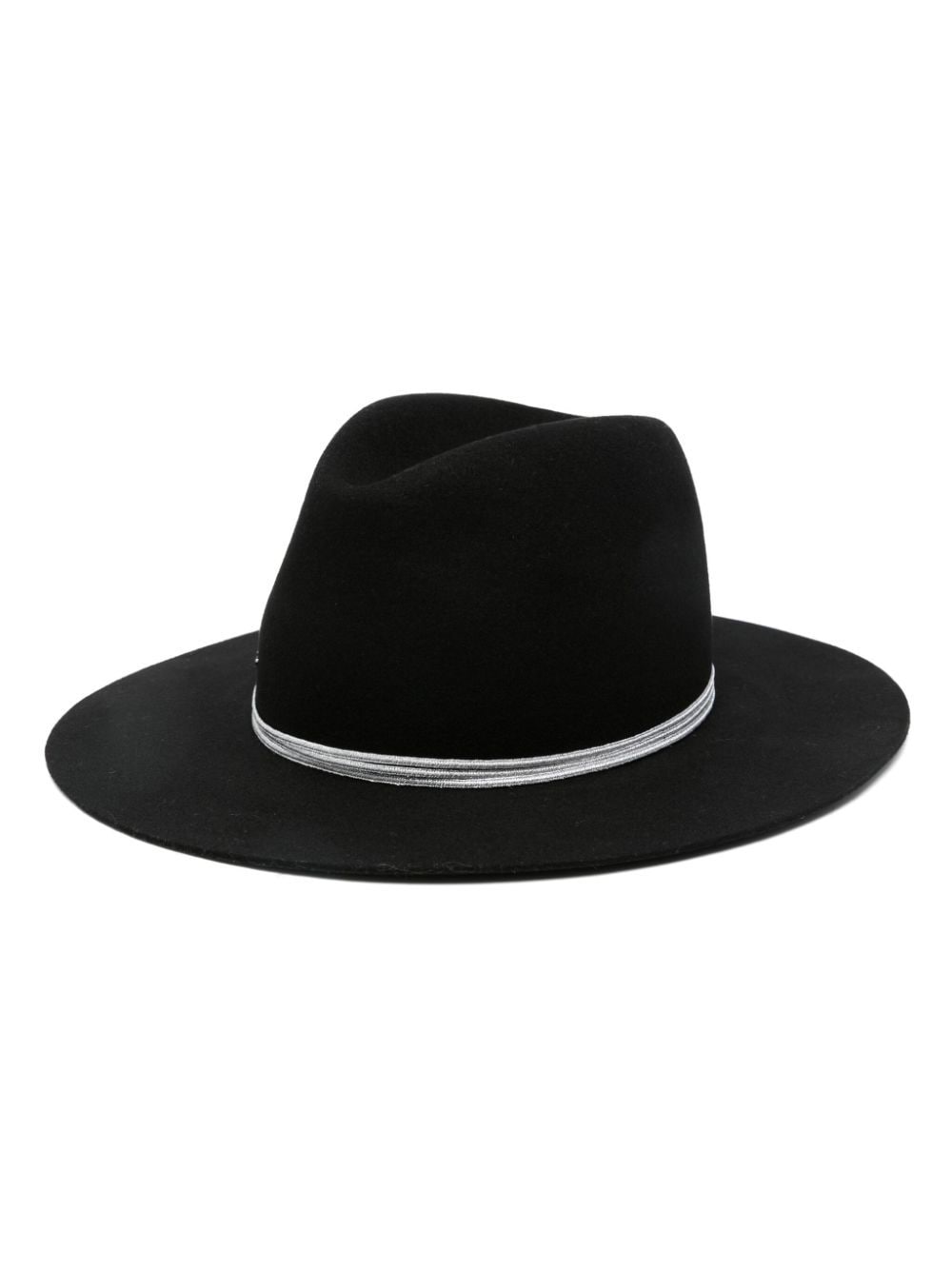 black wool felted centre-dent crown metallic detailing tonal logo plaque detachable chain-link strap stiff brim