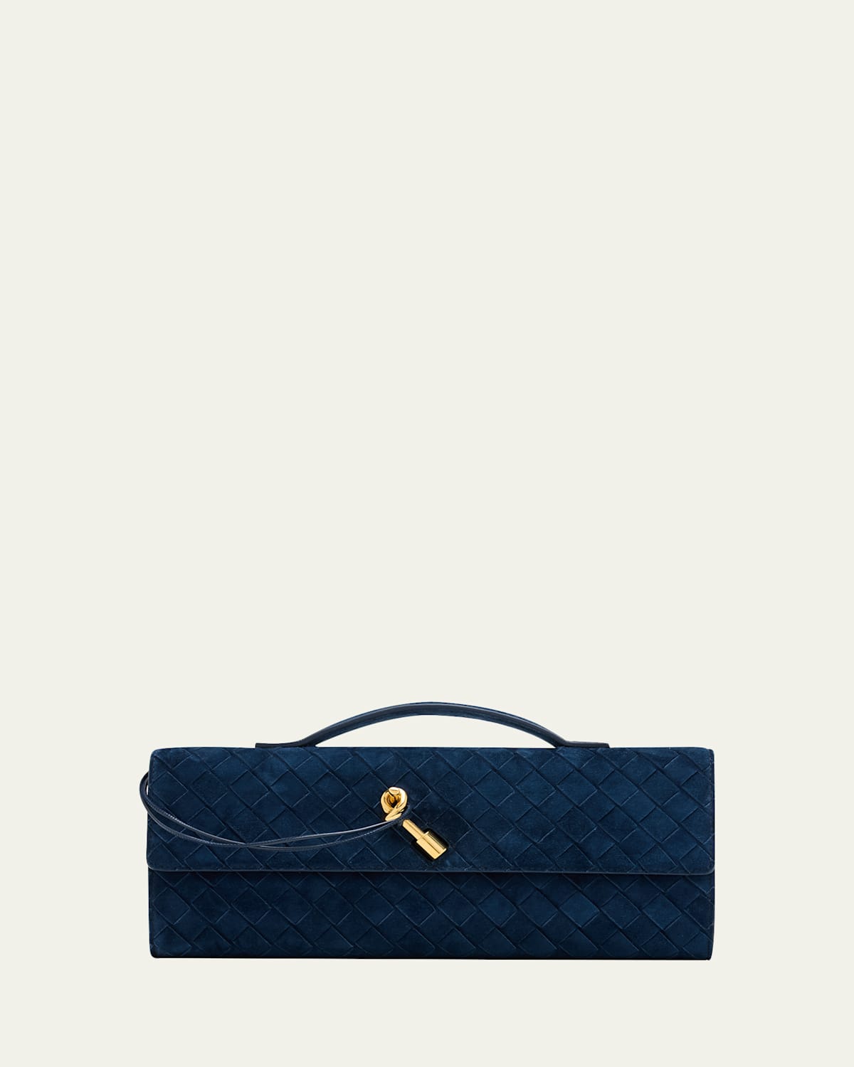 This Bottega Veneta "Andiamo" clutch bag is crafted in intrecciato suede with a signature knot accent Flat top handle, 0.8" drop Flap top with a knot prong clasp Interior, one slip pocket, six card slots Lambskin leather lining Approx. 5.1"H x 12.2"W x 1.2"D Made in Italy
