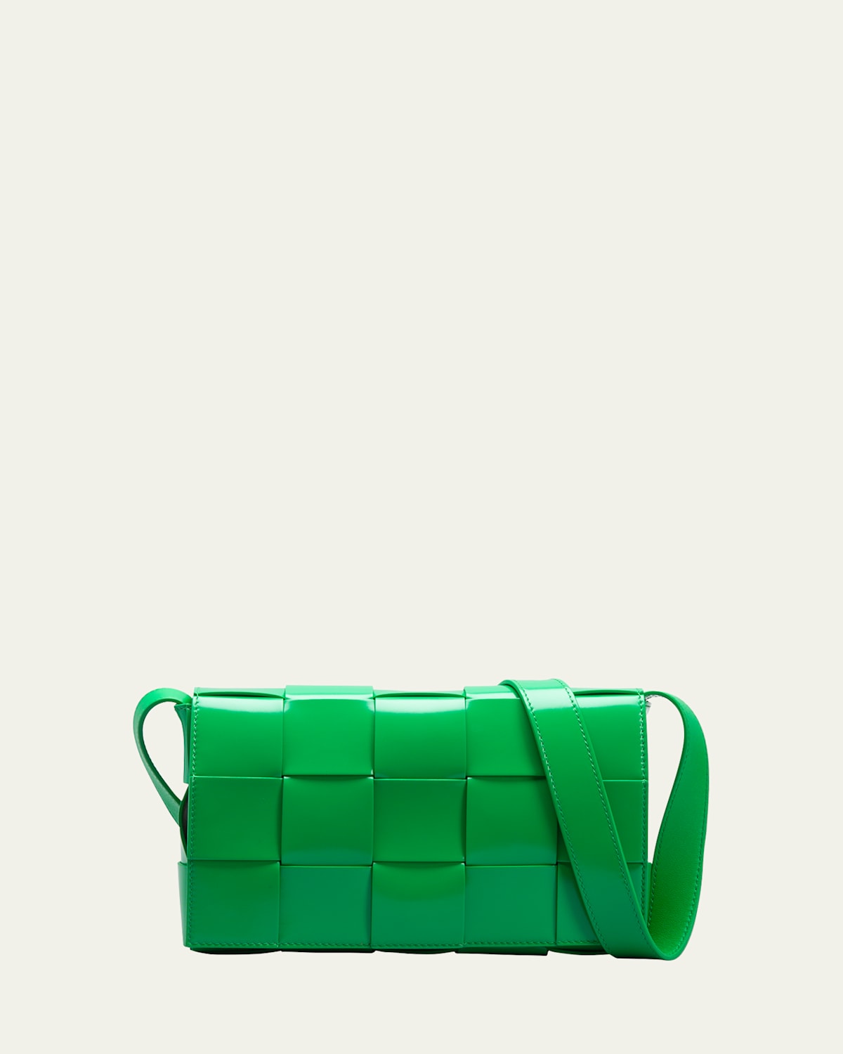 Bottega Veneta crossbody bag in largescale intrecciato woven lambskin leather. Adjustable shoulder strap. Flap top with magnetic closure. Interior, zip pocket. 5.9"H x 9.1"W x 2.2"D. Made in Italy.