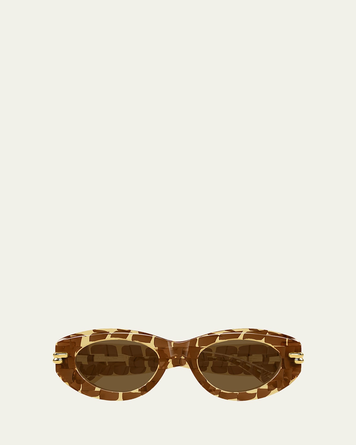 Crafted of tortoiseeffect acetate, these Bottega Veneta oval sunglasses offer a bold finish to any ensemble Eye/bridge/temple (in mm): 5516145 Monochromatic lenses Saddle nose bridge Signature ribbon motif at temples Thick, tapered arms Acetate 100% UVA/UVB protection Made in Italy