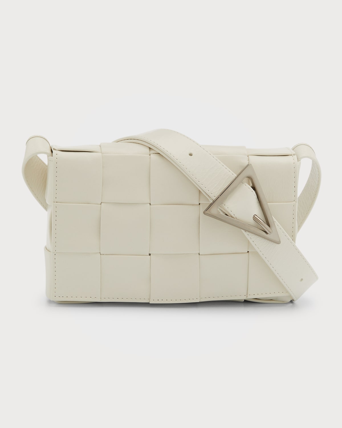 Bottega Veneta "Cassette" crossbody bag in intrecciato calf leather Adjustable convertible crossbody strap with signature triangle buckle, 20"25.5" drop Flap top with magnetic closure Interior, one zip pocket Approx. 4.1"H x 6.9"W x 1.4"D Item weight: 0.4 lbs. Made in Italy