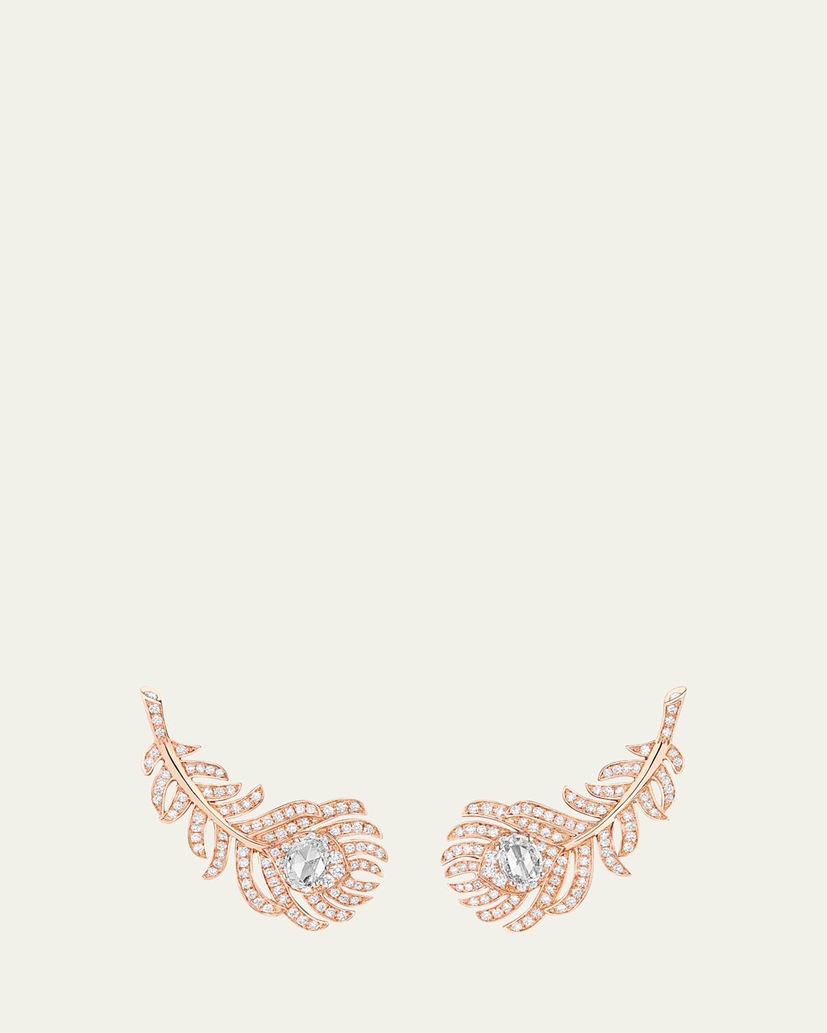 Plume de Paon earrings by Boucheron Approx. 1,22" length 18karat rose gold with a polished finish Rosecut diamonds and diamond pavé 0.45 total rosecut diamond carat weight 0.69 total diamond pavé carat weight Clipon backs Made in France