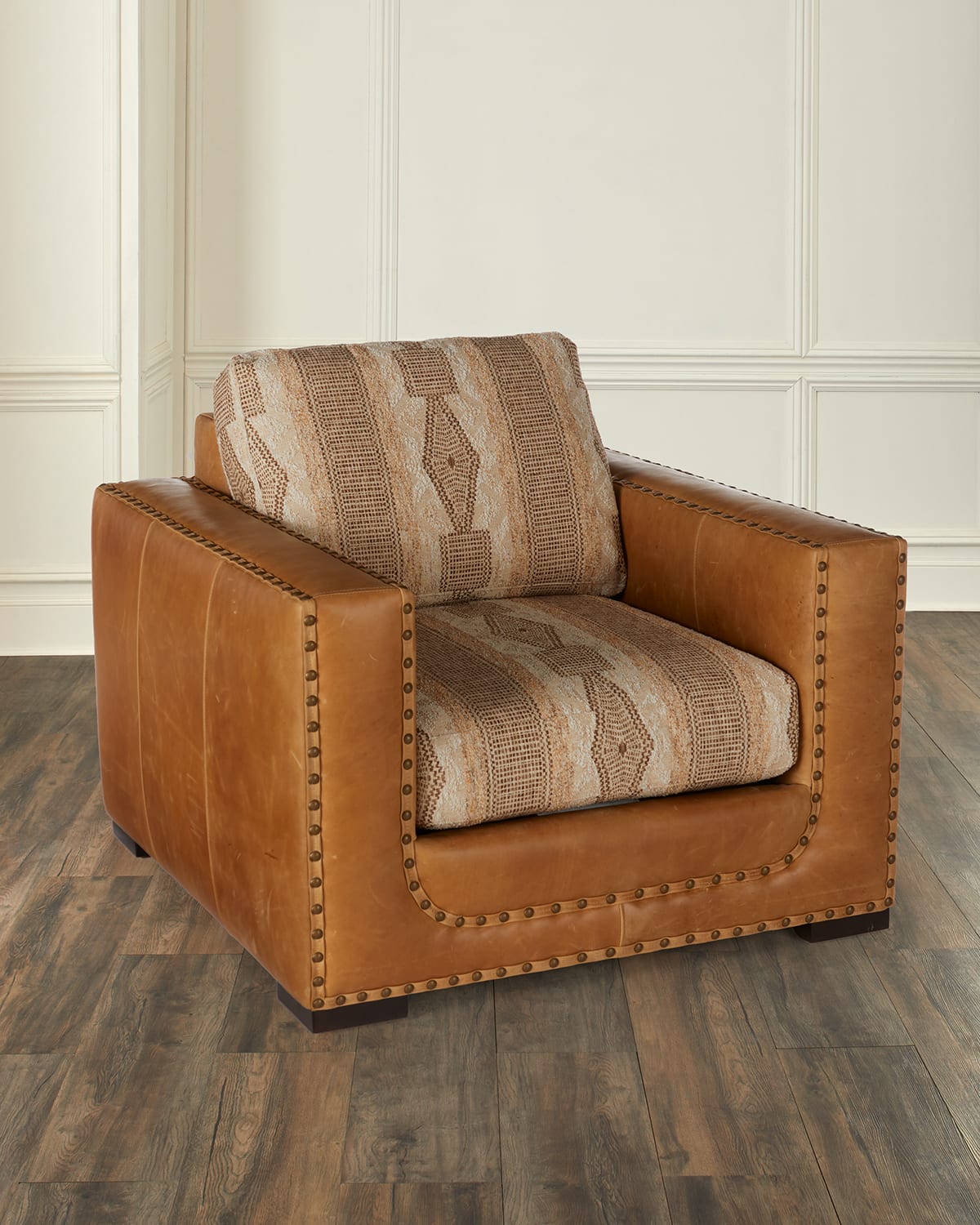 Grand in scale and comfort, the Peralta Chair is designed to grab attention. The wide track arms and frame are accentuated by a gorgeous gimp welt with antiqued brass nailheads that flows into a curved pattern to add dimension to the base of the sofa. The antiqued aniline leather has a finessed light brown color that highlights the true hallmark and beauty of the hide. A soft, drapey hand with stunning pullup qualities, it will age gracefully and maintain a wonderful patina. The seat cushion and back are fashioned in a soft accent print in beige and sand tones to add extra visual pop. Handcrafted of engineered hardwood and leather Cushions, polyester/cotton 8way handtied construction Overall, approx. 41.5"W x 41"D x 35"T Seat, 25"W x 23"D x 19"T Arm height, 26.5" Finished back Spot clean Weight, 110.0 lbs Made in USA Boxed weight, approximately 135.4 lbs