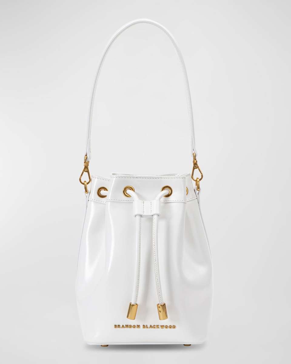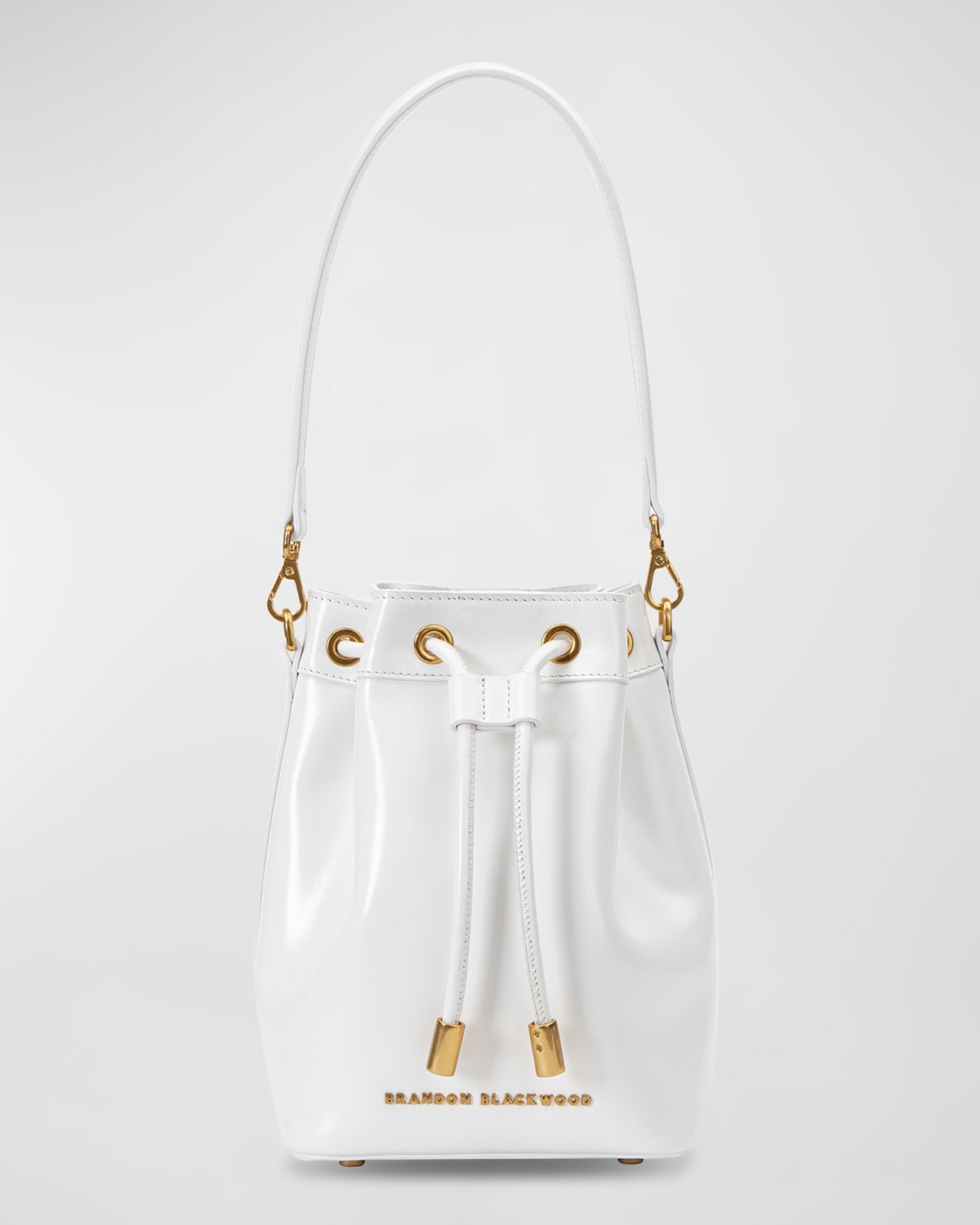Brandon Blackwood "Corey" bucket bag in shiny leather Detachable shoulder strap Detachable, adjustable crossbody strap Can be worn as a shoulder or crossbody bag Drawstring closure Interior, three card slots Feet protect bottom of bag Approx. 6"H x 6"W x 8"D Imported