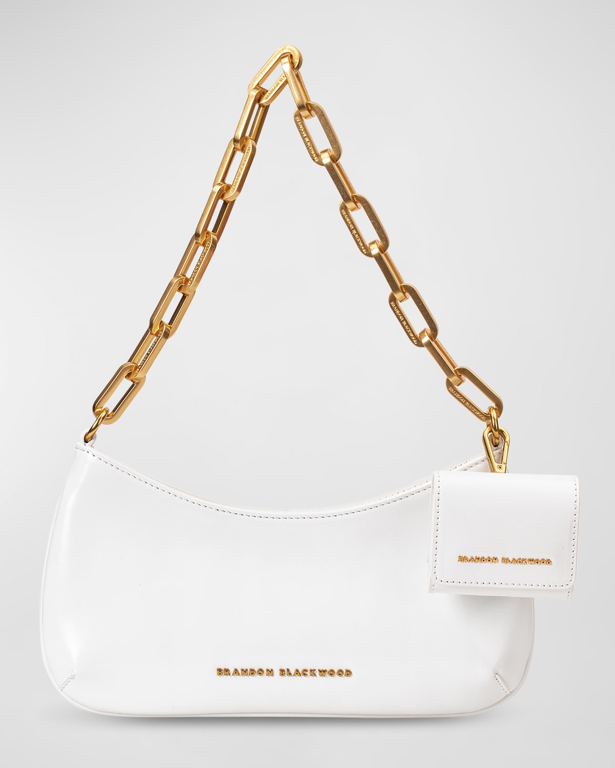 Brandon Blackwood "Jacqueline" shoulder bag in leather Chain shoulder strap with detachable flap pouch Zip top closure Exterior, one back slip pocket Interior, one zip pocket and one slip pocket Approx. 6"H x 10.6"W x 1.6"D Imported